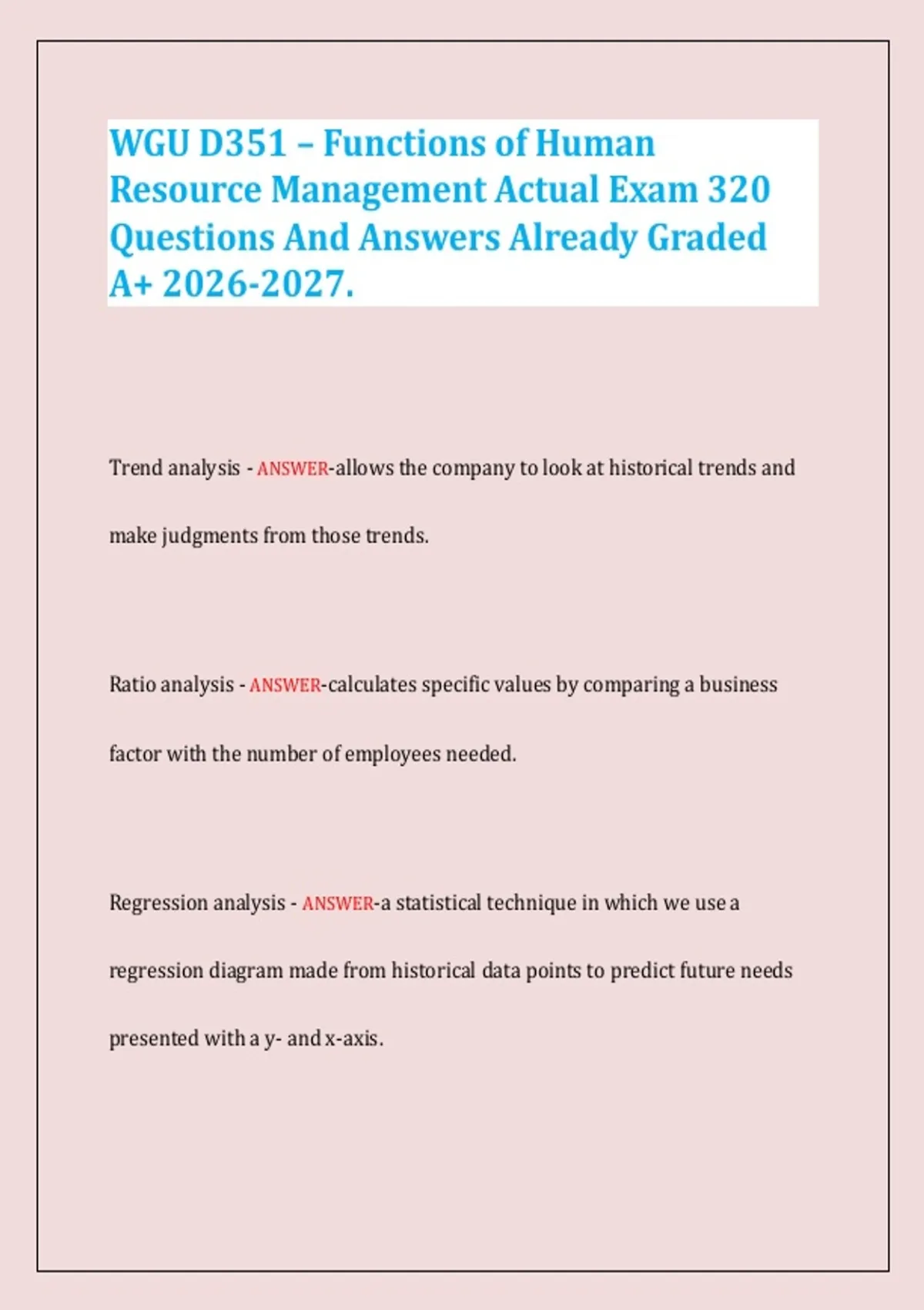 Prepare for the WGU D351 Functions of Human Resource Management exam with this comprehensive study guide featuring 320 actual exam questions and answers, already graded A+. Covering all key HRM topics—from recruitment and compensation to labor laws, performance appraisal, and strategic HR—this resource is aligned with the 2026–2027 exam cycle. Includes detailed explanations of essential concepts such as EEOC compliance, OSHA violations, motivation theories, job evaluation methods, and major employment legislation. Ideal for students seeking a thorough review and confident exam performance.