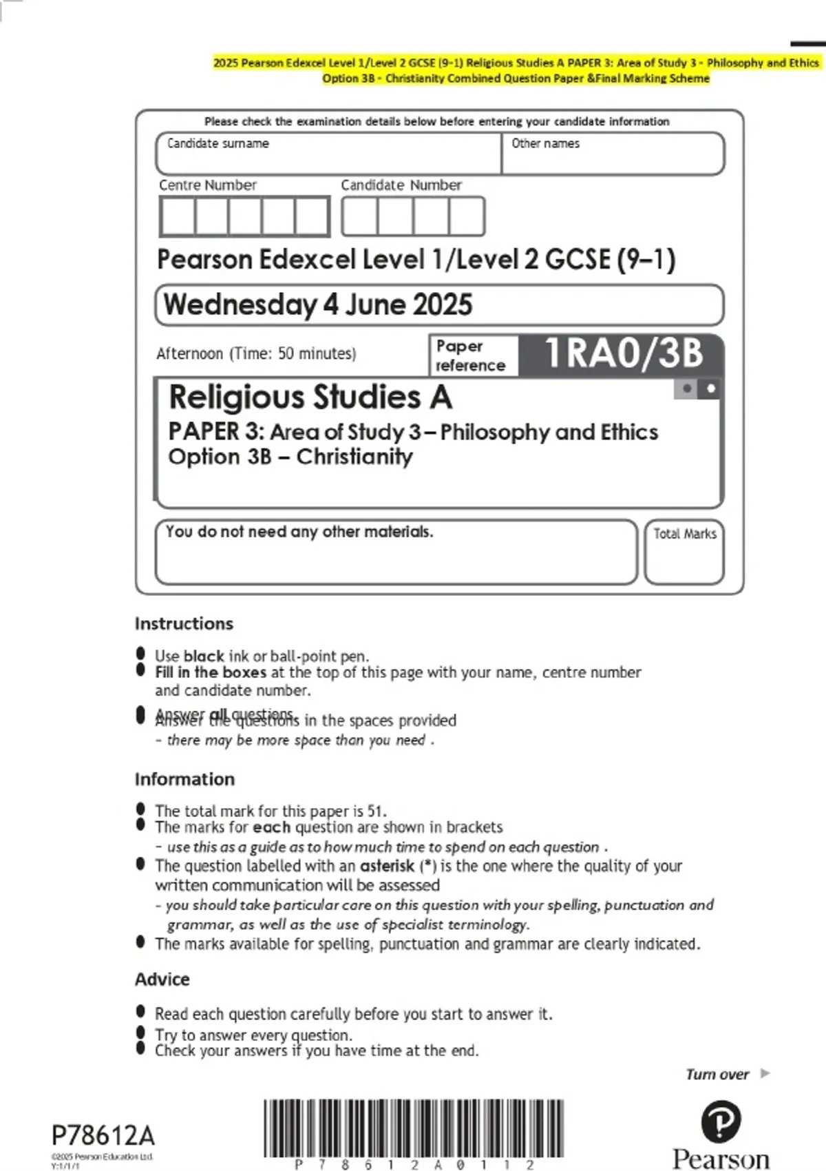 2025 Pearson Edexcel Level 1/Level 2 GCSE (9–1) Religious Studies A PAPER 3: Area of Study 3 – Philosophy and Ethics Option 3B – Christianity Exam Paper and marking scheme