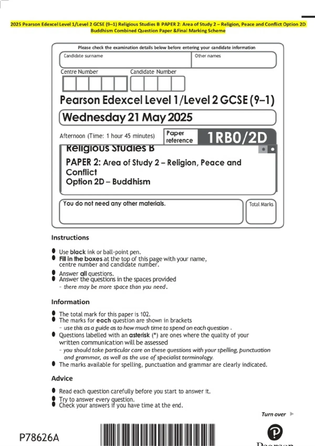 2025 Pearson Edexcel Level 1/Level 2 GCSE (9–1) Religious Studies B PAPER 2: Area of Study 2 – Religion, Peace and Conflict Option 2D Buddhism Exam Paper and marking scheme