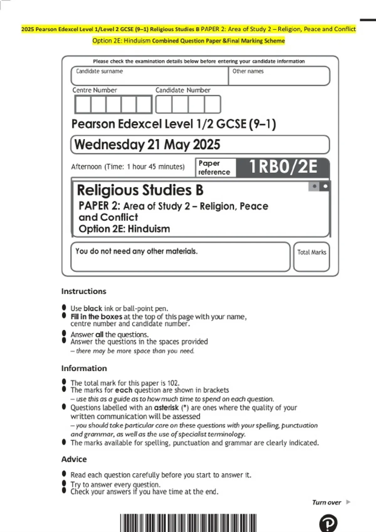 2025 Pearson Edexcel Level 1/Level 2 GCSE (9–1) Religious Studies B PAPER 2: Area of Study 2 – Religion, Peace and Conflict Option 2E: Hinduism Exam Paper and marking scheme