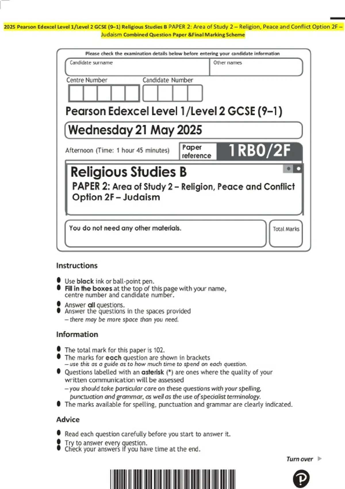 2025 Pearson Edexcel Level 1/Level 2 GCSE (9–1) Religious Studies B PAPER 2: Area of Study 2 – Religion, Peace and Conflict Option 2F – Judaism Exam Paper and marking scheme