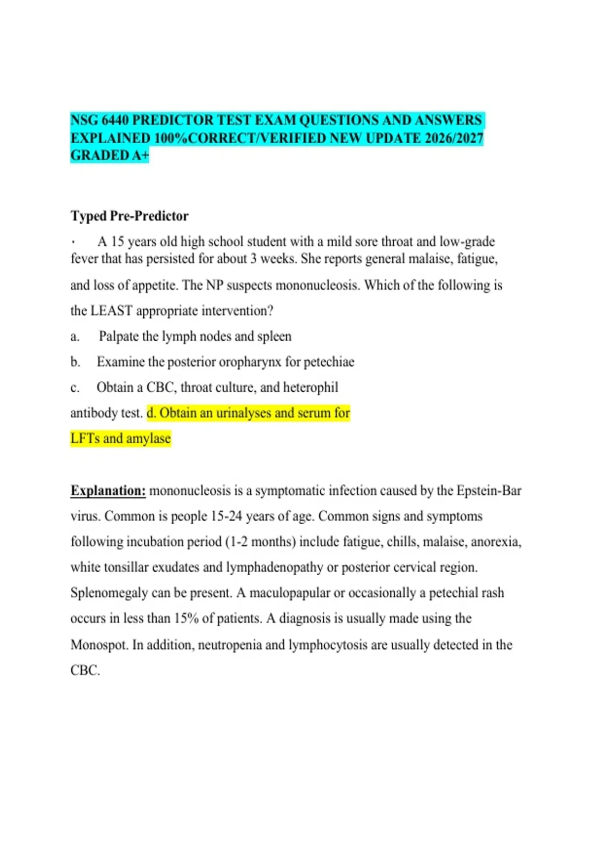 This document contains updated NSG 6440 predictor test exam questions with fully explained, correct, and verified answers for the 2026/2027 academic period. It focuses on advanced nursing concepts, clinical decision-making, and exam-style scenarios, making it suitable for final review and predictor exam preparation, with content already graded A+.