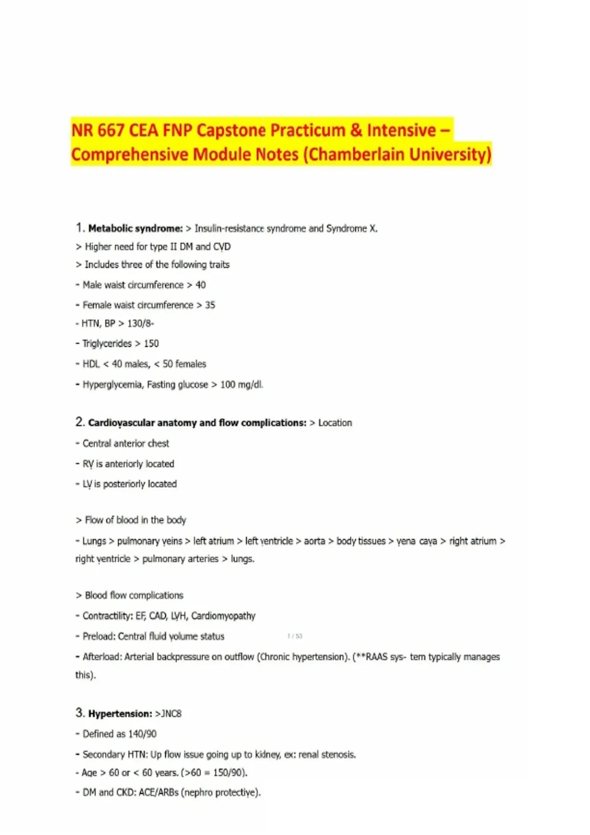 NR 667 CEA FNP Capstone Practicum & Intensive – Comprehensive Module Notes (Chamberlain University)This NR 667 CEA FNP Capstone Practicum & Intensive Module Notes is a complete study resource designed for Family Nurse Practitioner (FNP) students at Chamberlain University. It organizes high‑yield clinical content into clear, exam‑ready notes that align with advanced practice nursing standards and capstone expectations. What’s Inside: - Metabolic Syndrome – Diagnostic criteria, cardiovascular risk, and diabetes associations. - Cardiovascular Anatomy & Flow – Blood flow pathways, preload/afterload/contractility complications. - Hypertension (JNC8 Guidelines) – First‑line therapies, race‑based considerations, secondary causes, and medication pearls. - Heart Failure (HFrEF & HFpEF) – Classifications, symptoms, causes, and evidence‑based treatments. - Lipid Management – Statins, ezetimibe, PCSK9 inhibitors, familial hyperlipidemia. - Valve Disease & Aneurysms – Murmur identification, Stanford A/B aneurysm classification, risk factors, and management. - DVT/PE Management – Virchow’s triad, diagnostics, anticoagulation strategies, provoked vs. unprovoked. - PAD & Pericardial Effusion – Clinical findings, ABI, angiography, stents, effusion/tamponade management. - Atrial Arrhythmias – AFib and Aflutter recognition, CHADS‑VASc scoring, rate vs. rhythm control. - Anticoagulation Bridging – Warfarin initiation, INR targets, heparin/LMWH bridging considerations. Key Benefits: - Comprehensive coverage of capstone exam topics. - Verified notes aligned with Chamberlain University FNP curriculum. - Perfect for exam prep, quick review, and clinical application. - Helps students build confidence for final practicum and intensive assessments