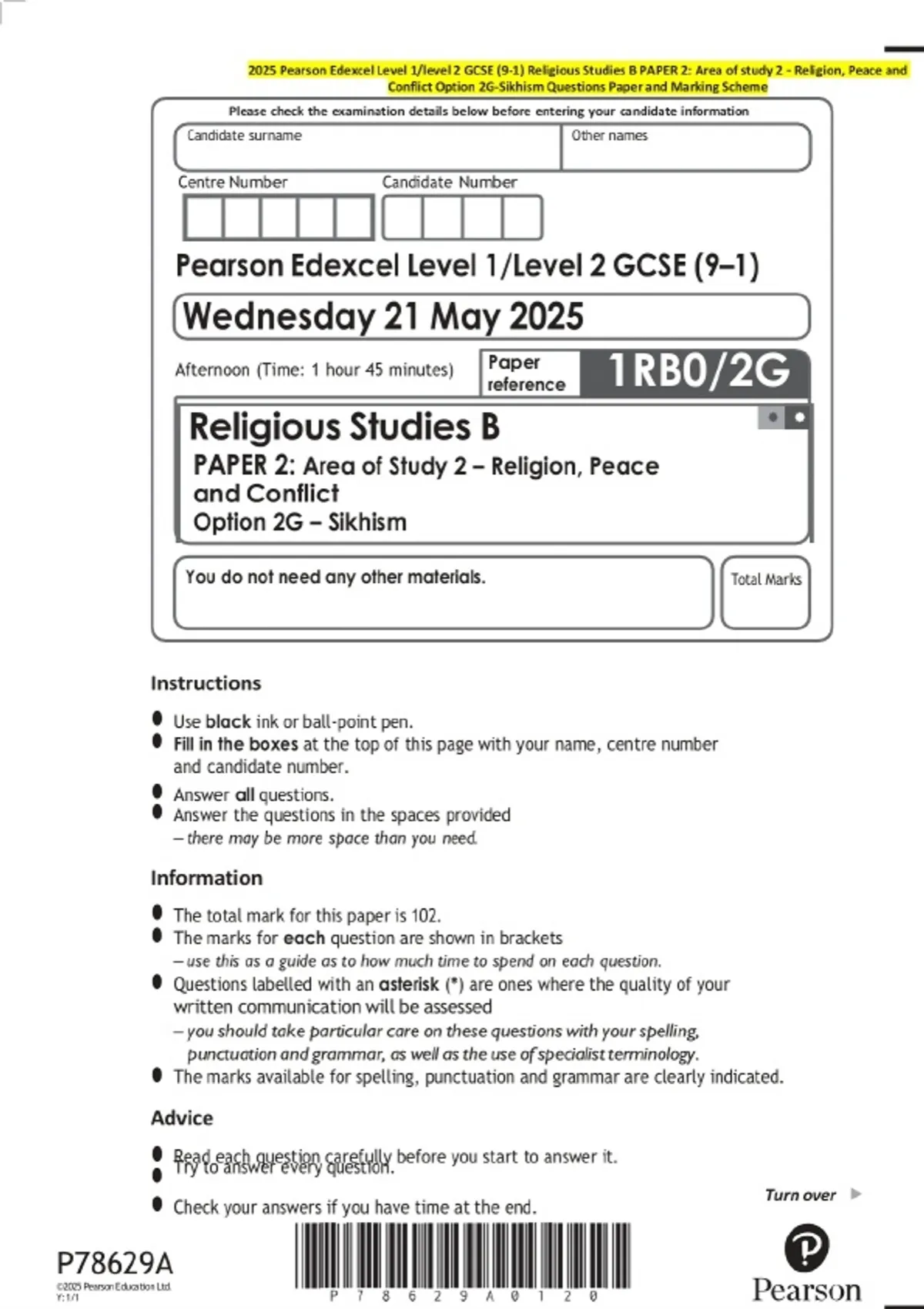 2025 Pearson Edexcel Level 1/level 2 GCSE (9-1) Religious Studies B PAPER 2: Area of study 2 – Religion, Peace and Conflict Option 2G-Sikhism Exam Paper and marking scheme
