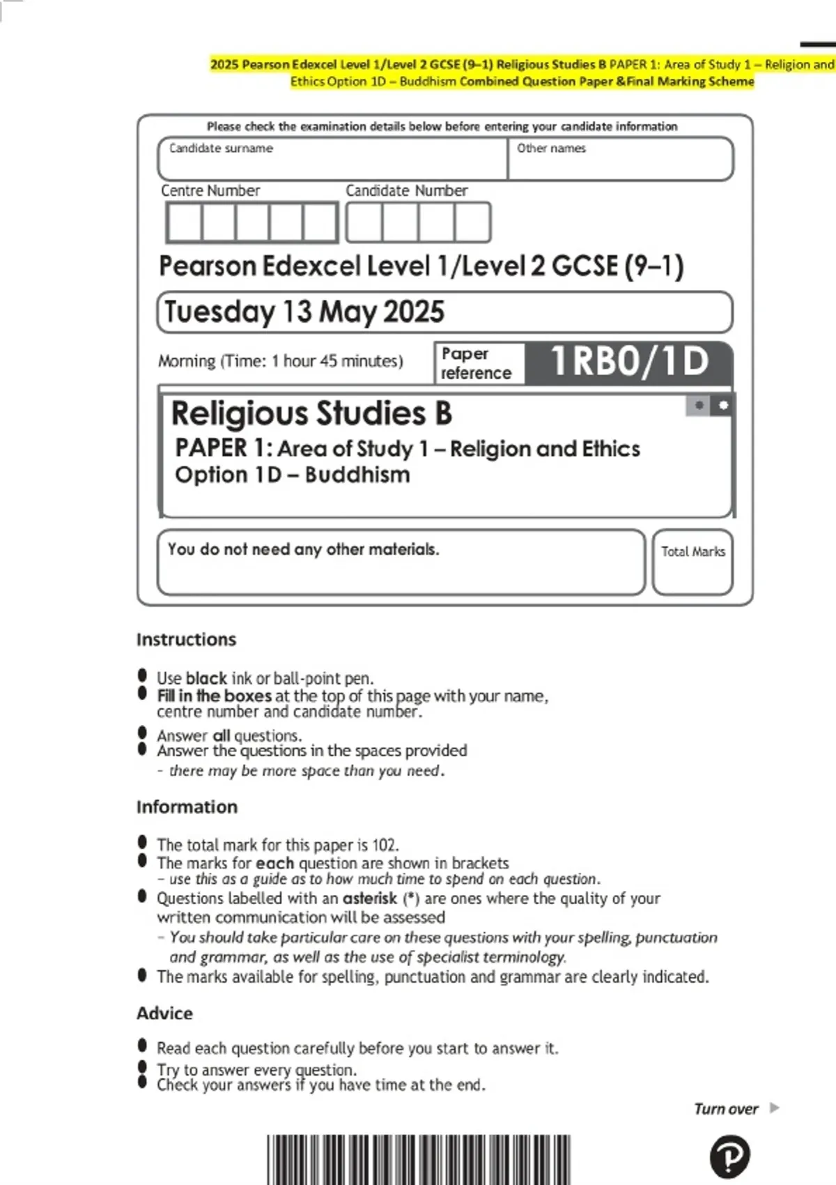 2025 Pearson Edexcel Level 1/Level 2 GCSE (9–1) Religious Studies B PAPER 1: Area of Study 1 – Religion and Ethics Option 1D – Buddhism Exam Paper and marking scheme