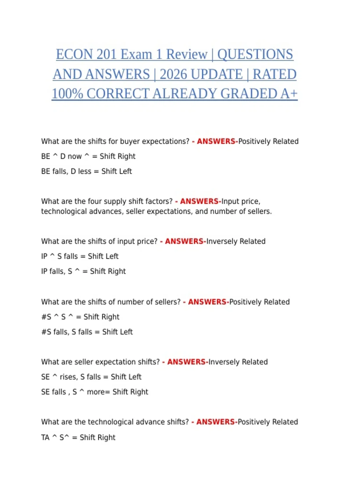This ECON 201 – Exam 1 Review | Questions & Verified Answers (2026 Edition, 100% Correct, A+) is a comprehensive study resource designed to help students excel in their first ECON 201 exam. The document features carefully selected questions paired with verified correct answers and detailed explanations, making it an essential tool for exam preparation, revision, and self-assessment. The content aligns with current economics curriculum standards and is updated for 2026 coursework, covering key topics such as supply and demand, market equilibrium, elasticity, consumer behavior, production, and basic economic models. Each question and solution is structured to enhance understanding, reinforce critical thinking, and support confident performance in both exams and applied scenarios.