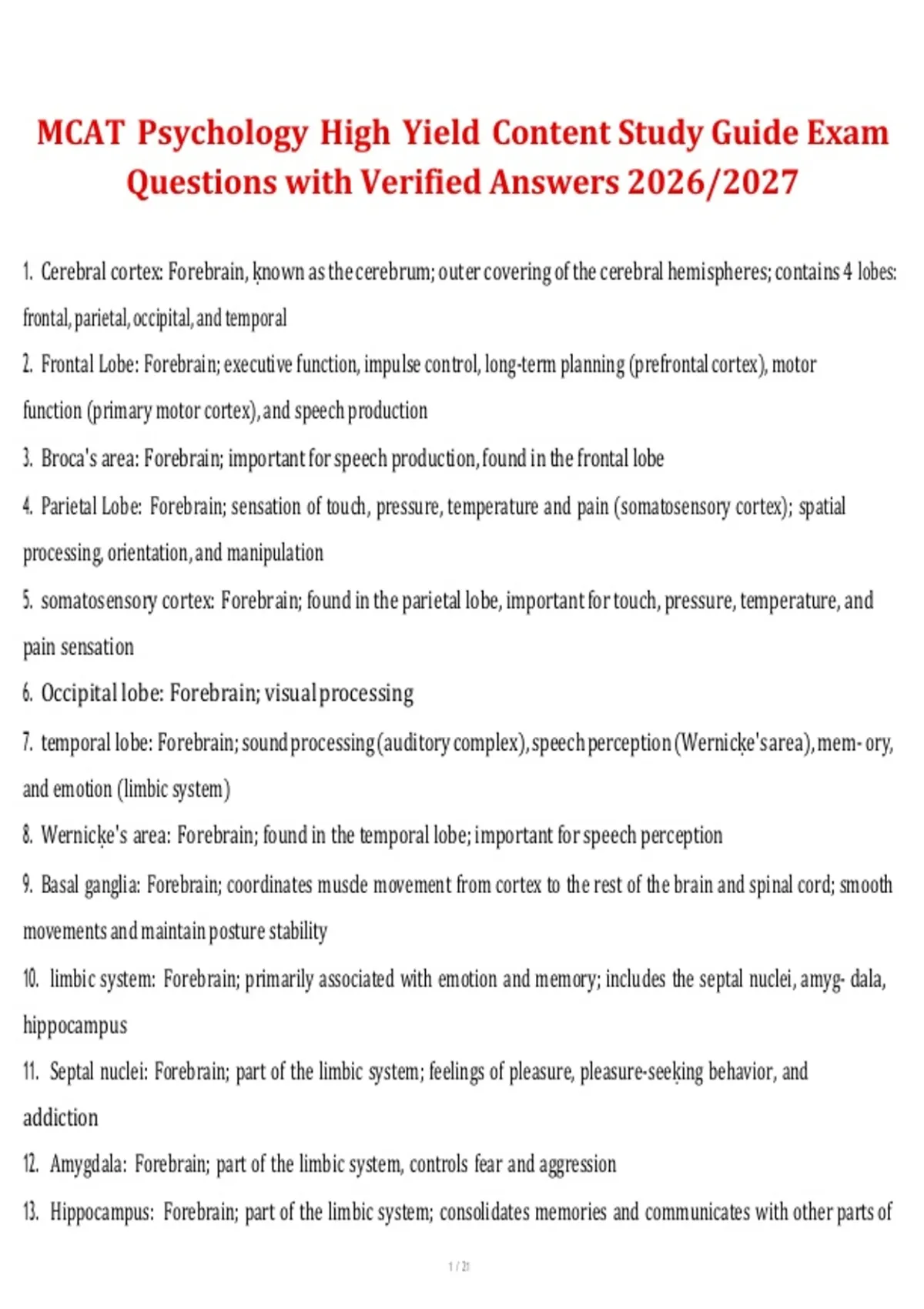 This high-yield study guide focuses on the most frequently tested psychology concepts on the MCAT, presented through targeted exam-style questions with verified answers. It covers essential topics such as behavior and cognition, learning and memory, motivation and emotion, psychological disorders, and research methods, making it ideal for efficient and focused preparation for the 2026/2027 exam cycle.
