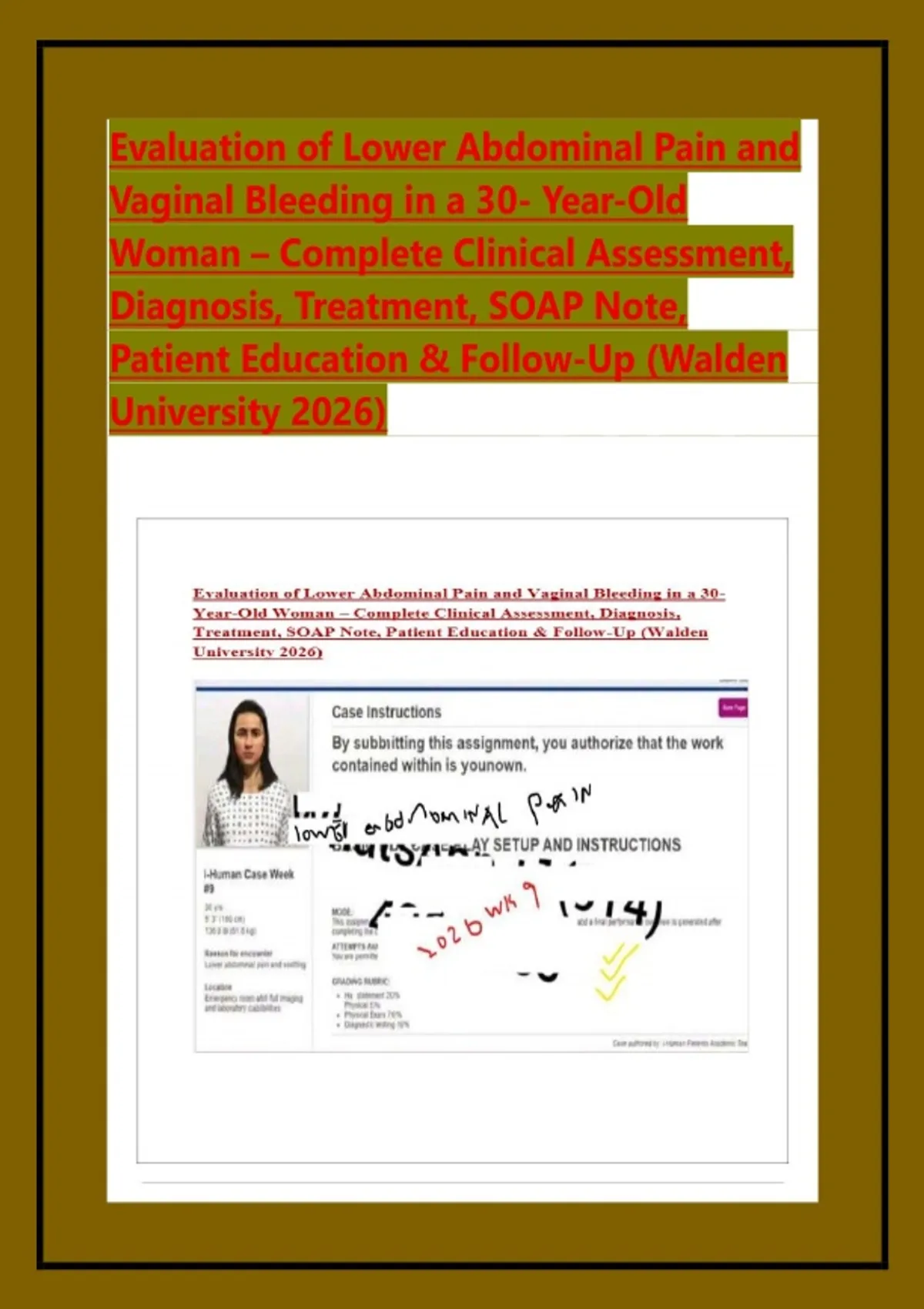 Evaluation of Lower Abdominal Pain and Vaginal Bleeding in a 30- Year-Old Woman – Complete Clinical Assessment, Diagnosis, Treatment, SOAP Note, Patient Education & Follow-Up (Walden University 2026)