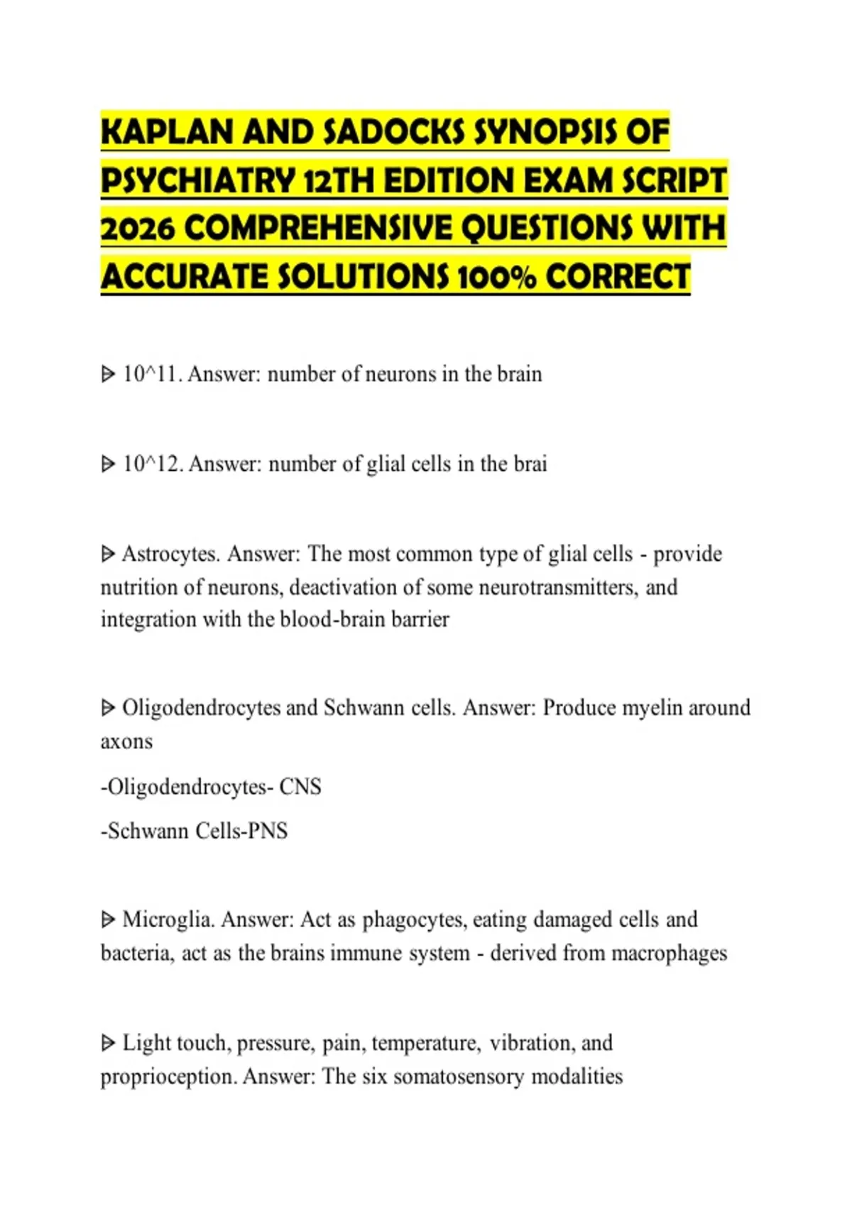 KAPLAN AND SADOCKS SYNOPSIS OF PSYCHIATRY 12TH EDITION EXAM SCRIPT 2026 COMPREHENSIVE QUESTIONS WITH ACCURATE SOLUTIONS 100% CORRECT