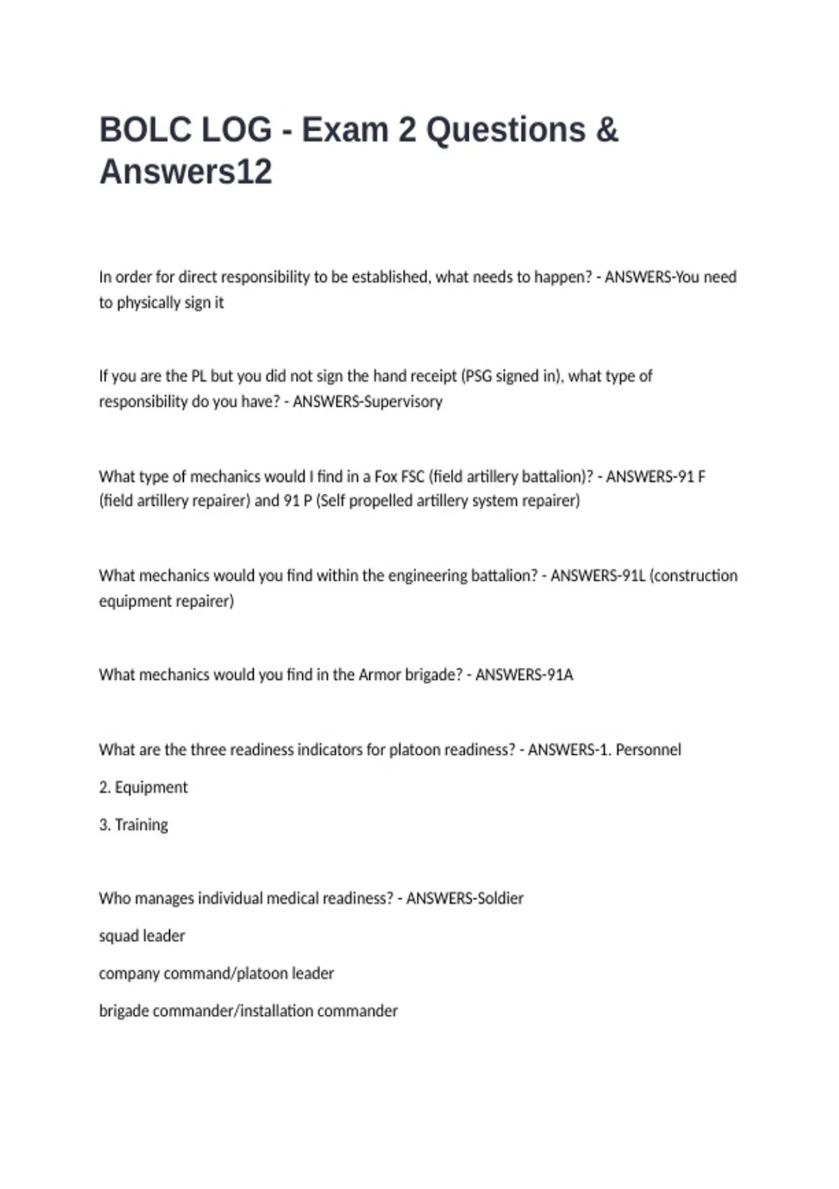 BOLC LOG - Exam 2 Questions & Answers