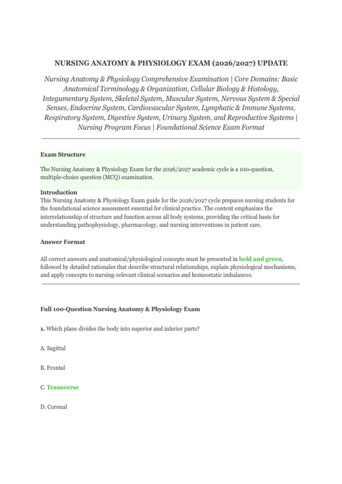 The Nursing Anatomy & Physiology Exam for the 2026/2027 academic cycle is a 100-question,