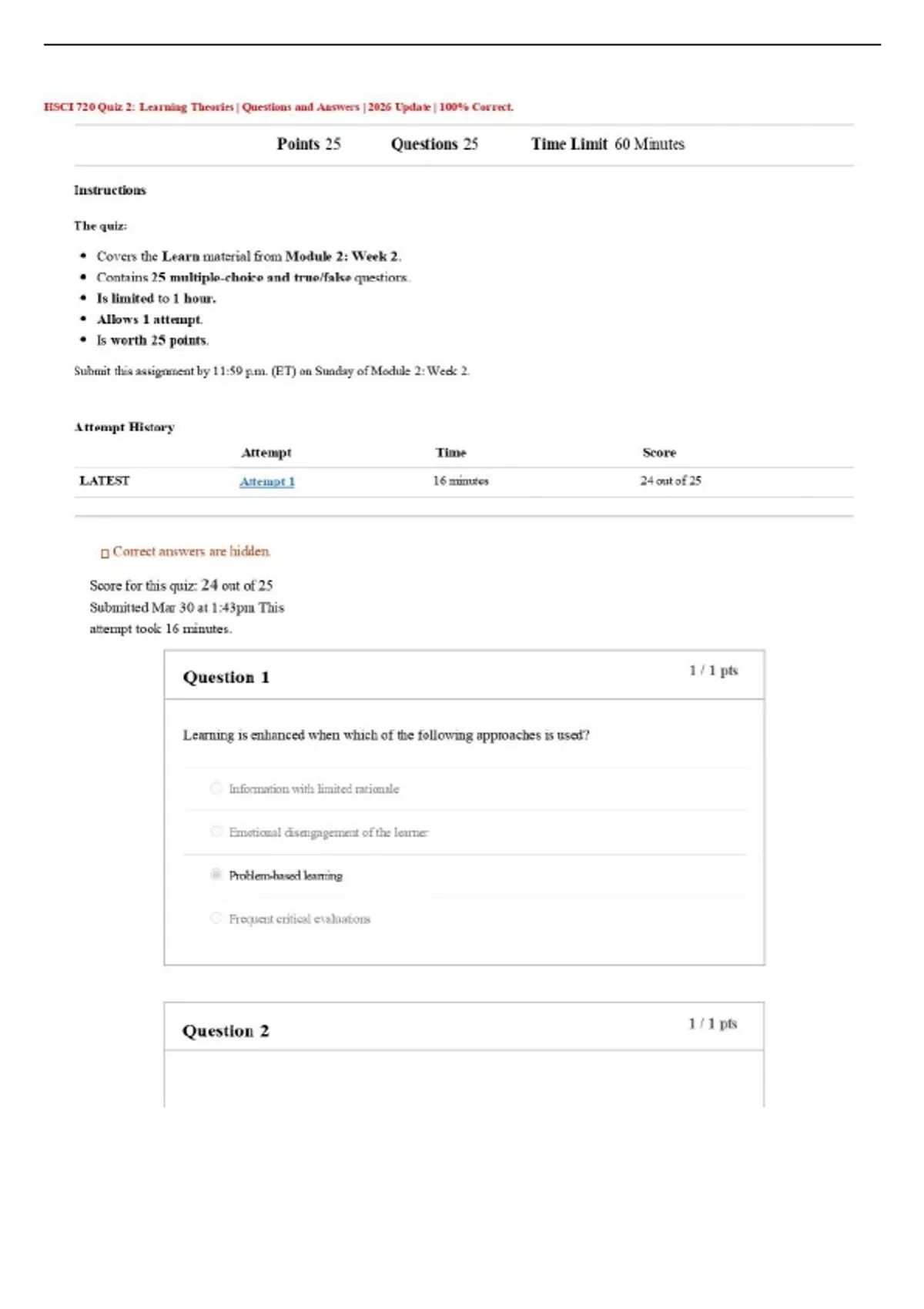 HSCI 720 Quiz 2: Learning Theories | Questions and Answers | 2026 Update | 100% Correct.