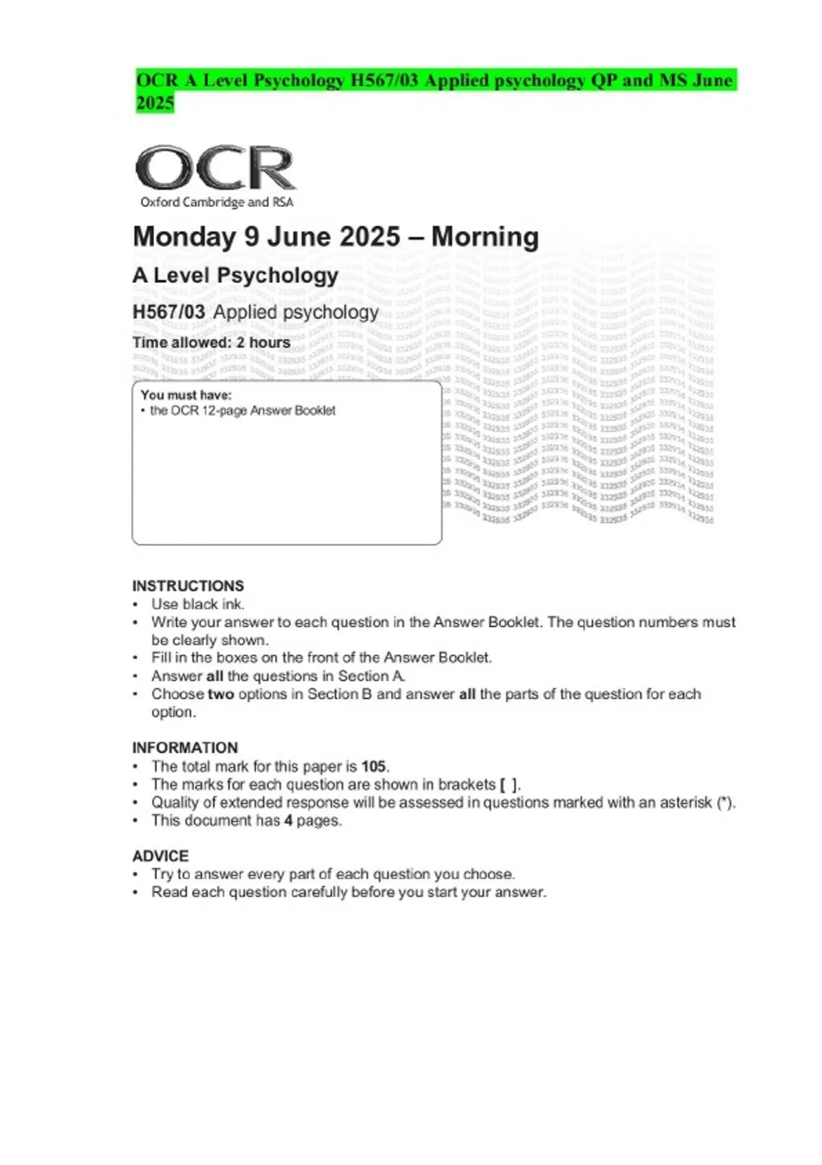 OCR A Level Psychology H567/03 Applied psychology QP and MS June 2025