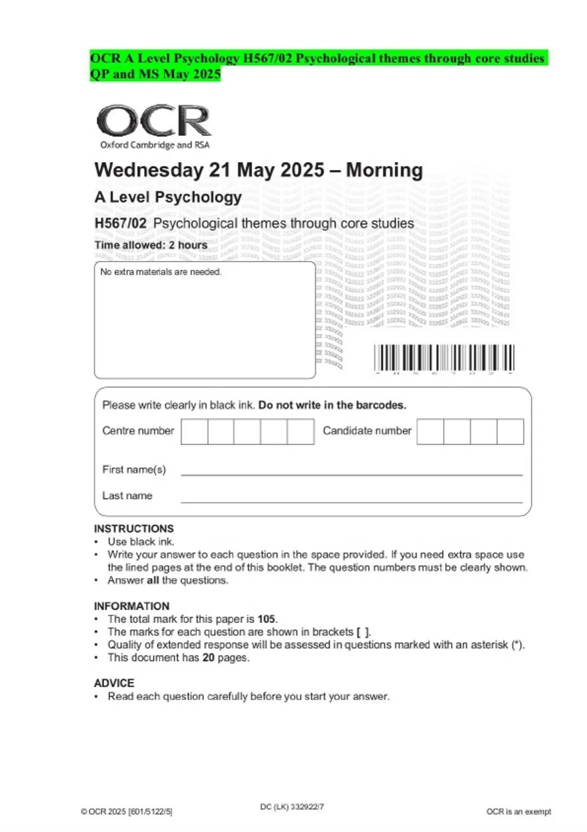 OCR A Level Psychology H567/02 Psychological themes through core studies QP and MS May 2025