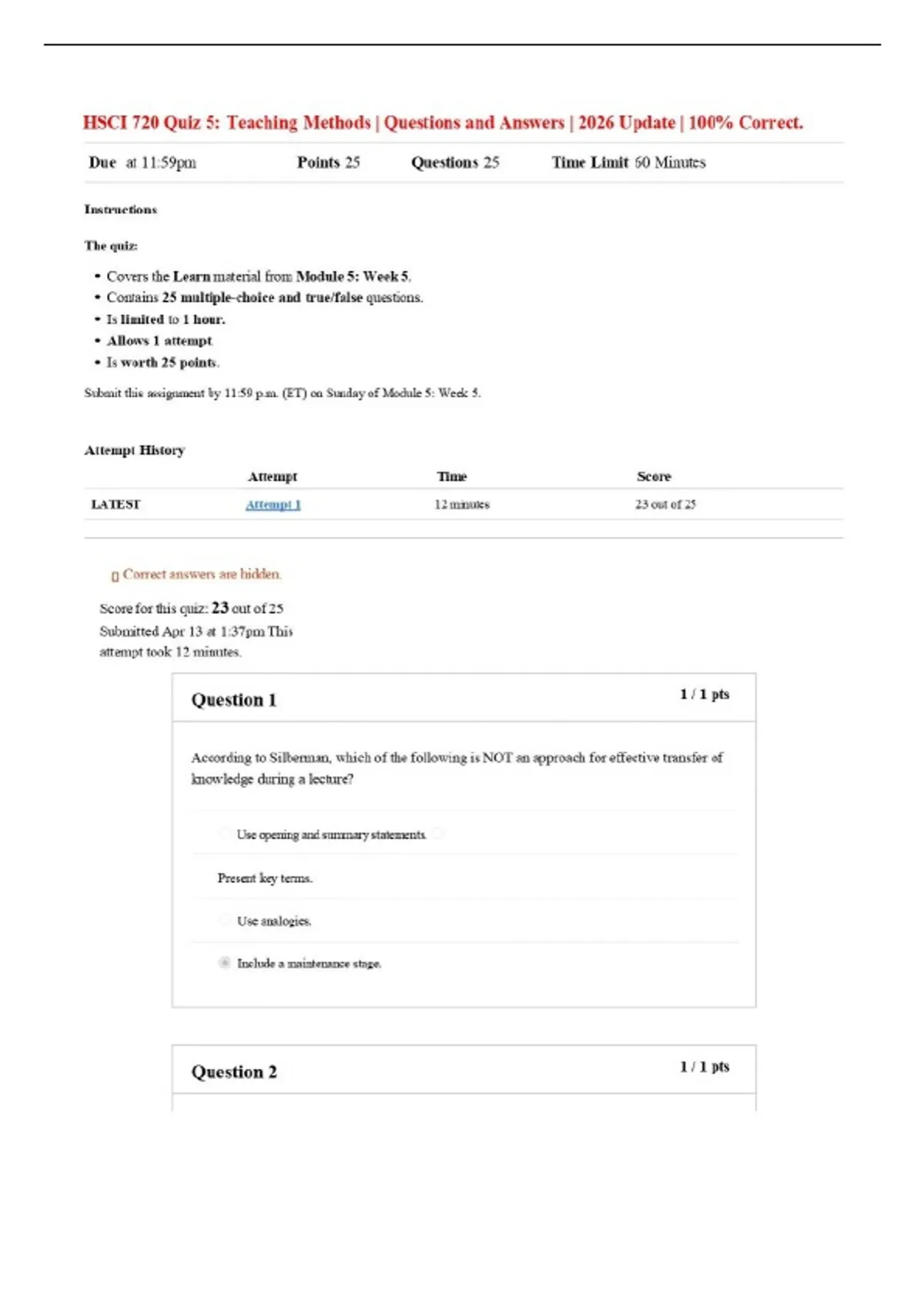 HSCI 720 Quiz 5: Teaching Methods | Questions and Answers | 2026 Update | 100% Correct.