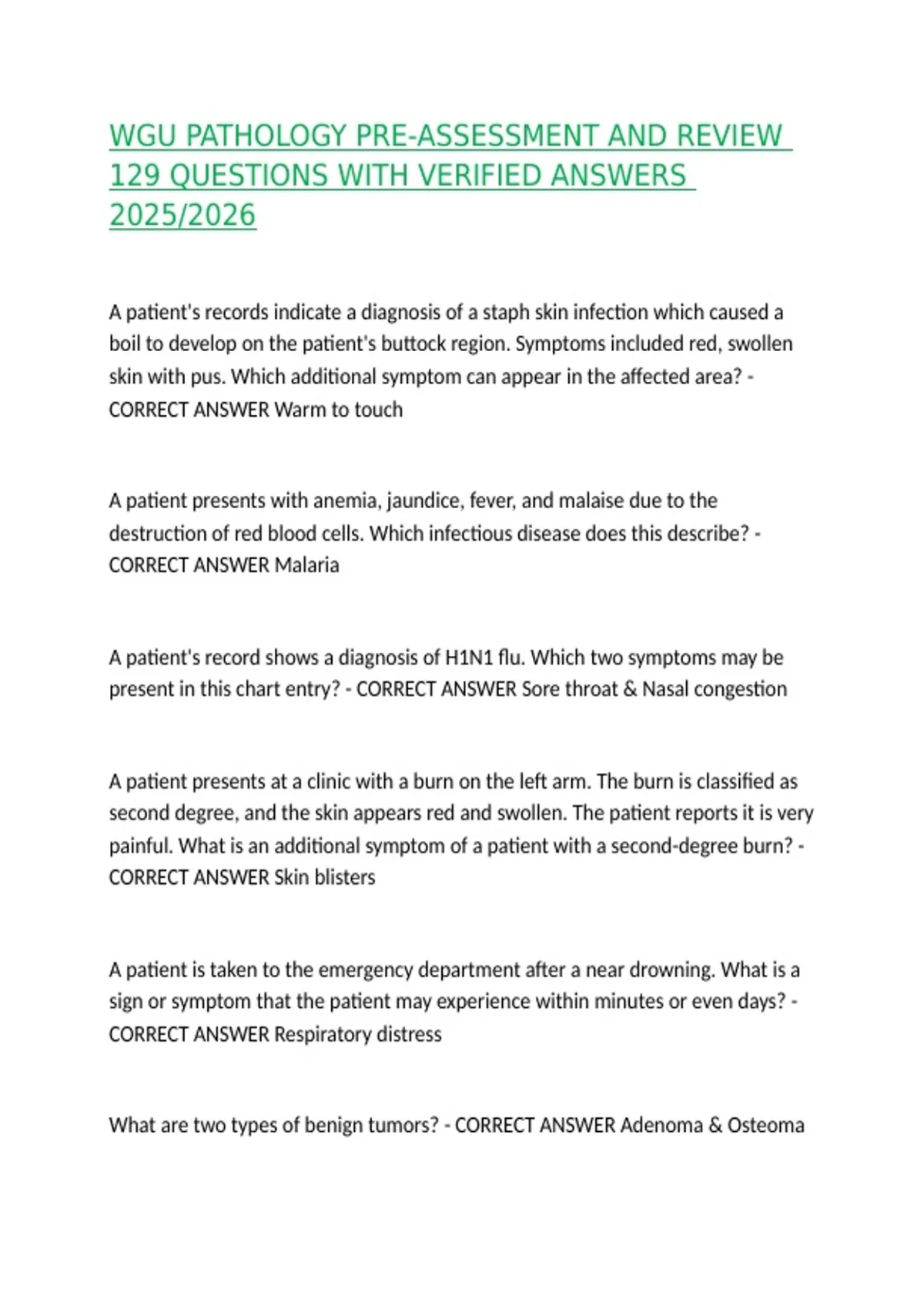 WGU PATHOLOGY PRE-ASSESSMENT AND REVIEW 129 QUESTIONS WITH VERIFIED ANSWERS 2025/2026 A patient's records indicate a diagnosis of a staph skin infection which caused a boil to develop on the patient's buttock region. Symptoms included red, swollen skin with pus. Which additional symptom can appear in the affected area? - CORRECT ANSWER Warm to touch A patient presents with anemia, jaundice, fever, and malaise due to the destruction of red blood cells. Which infectious disease does this describe? - CORRECT ANSWER Malaria A patient's record shows a diagnosis of H1N1 flu. Which two symptoms may be present in this chart entry? - CORRECT ANSWER Sore throat & Nasal congestion A patient presents at a clinic with a burn on the left arm. The burn is classified as second degree, and the skin appears red and swollen. The patient reports it is very painful. What is an additional symptom of a patient with a second-degree burn? - CORRECT ANSWER Skin blisters A patient is taken to the emergency department after a near drowning. What is a sign or symptom that the patient may experience within minutes or even days? - CORRECT ANSWER Respiratory distress