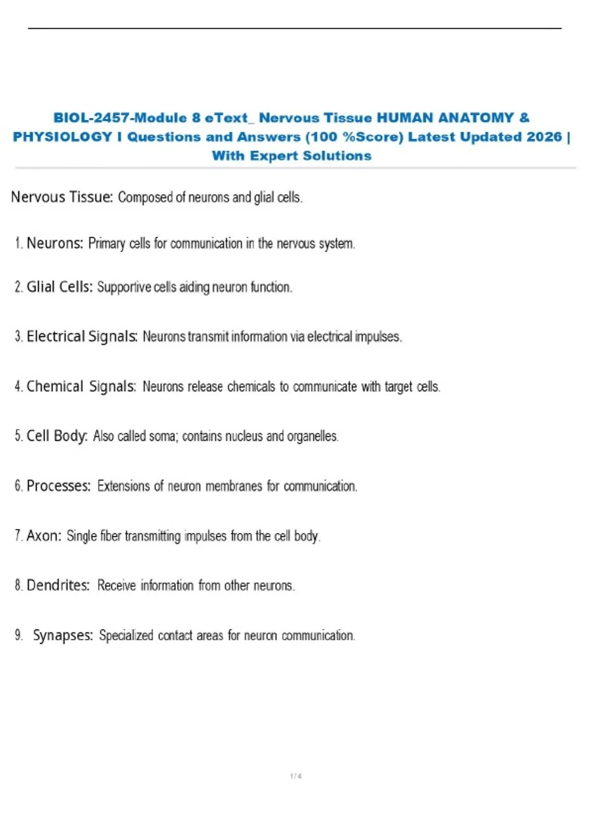 BIOL-2457-Module 8 eText_ Nervous Tissue HUMAN ANATOMY & PHYSIOLOGY I Questions and Answers (100 %Score) Latest Updated 2026 | With Expert Solutions