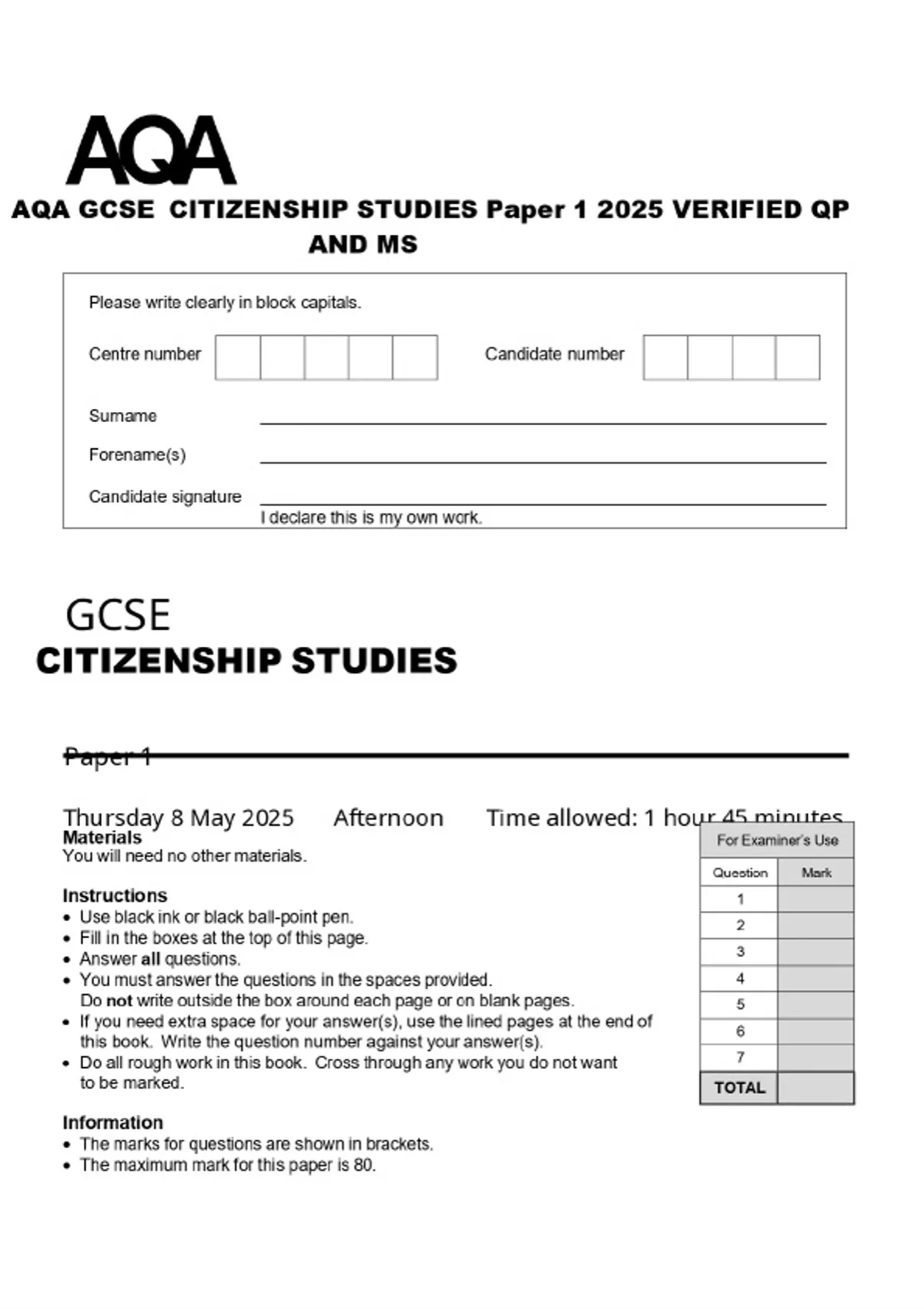 AQA GCSE CITIZENSHIP STUDIES Paper 1 2025 VERIFIED QP AND MS