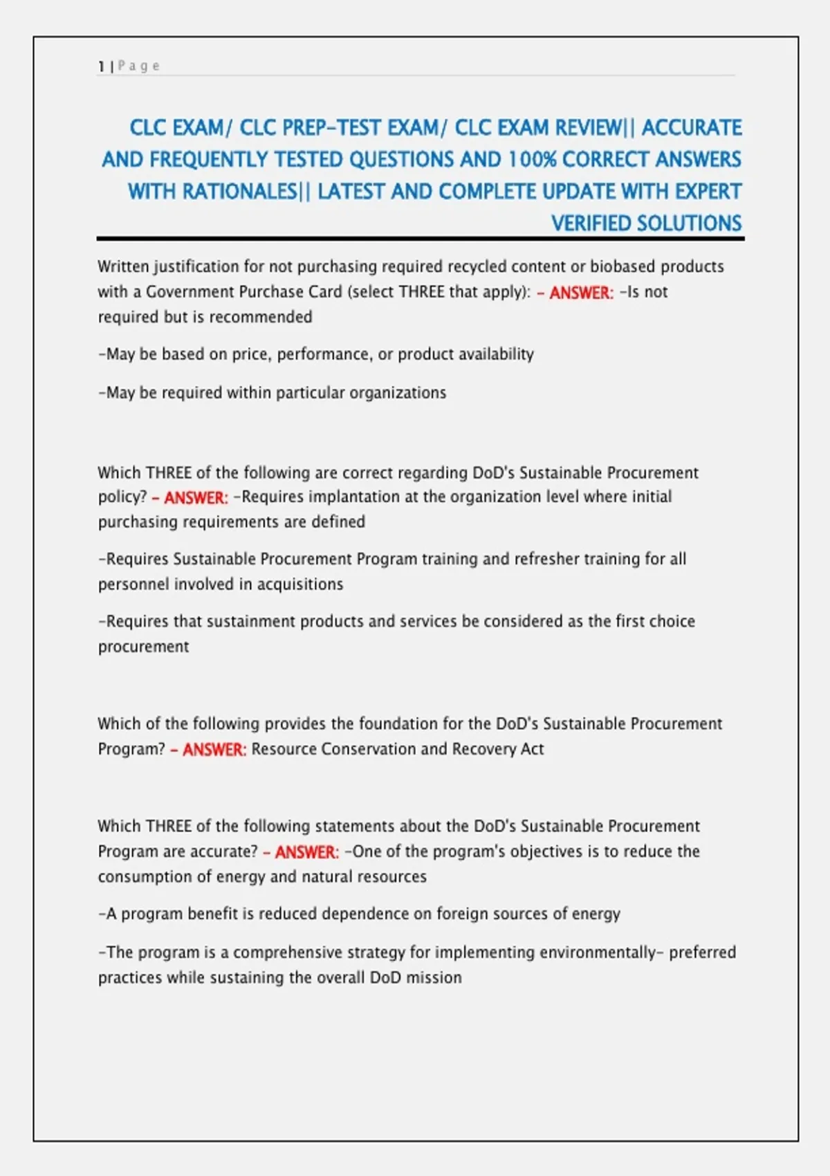 The CLC Exam Prep-Test and CLC Exam Review question bank provides accurate, frequently tested questions with 100% correct verified answers and detailed rationales. Fully updated and expert reviewed, this exam resource supports focused study, exam readiness, and mastery of DoD Sustainable Procurement concepts for confident performance and success.