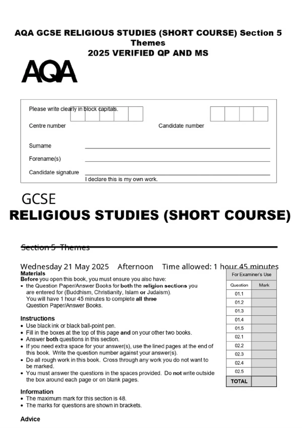 AQA GCSE RELIGIOUS STUDIES (SHORT COURSE) Section 5 Themes 2025 VERIFIED QP AND MS