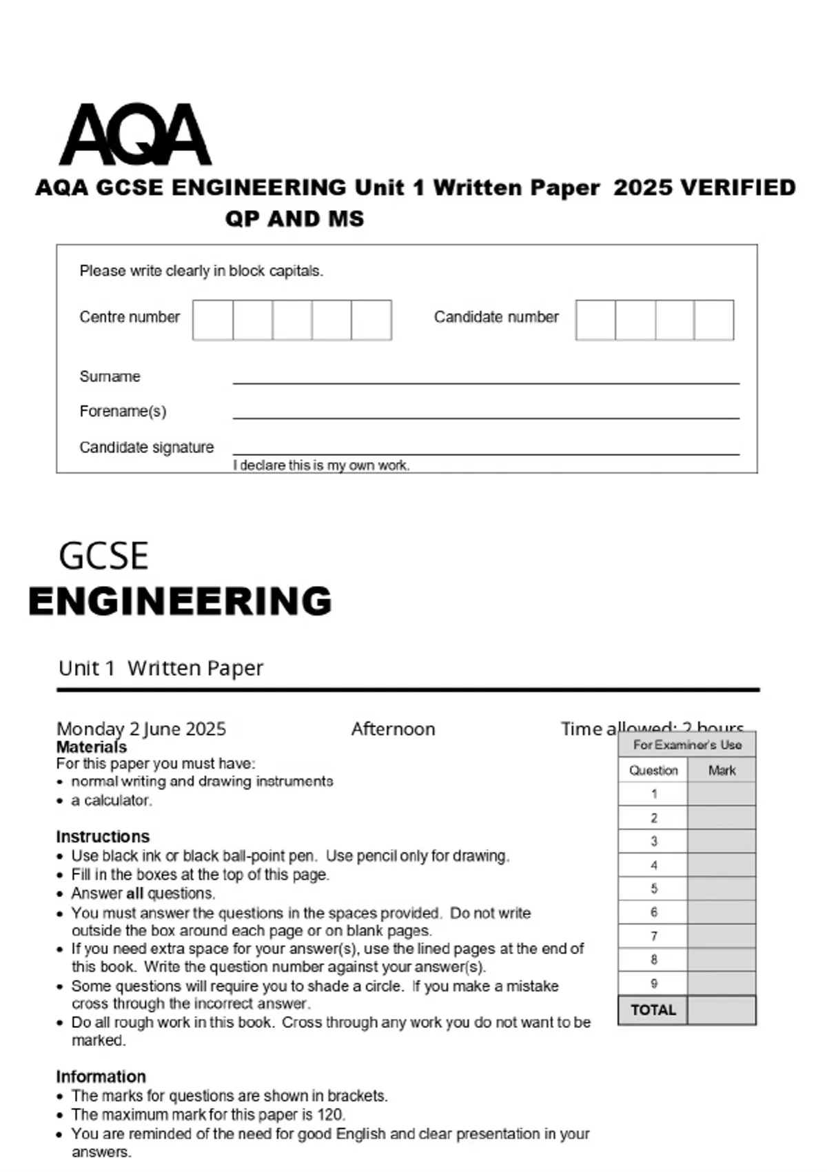 AQA GCSE ENGINEERING Unit 1 Written Paper 2025 VERIFIED QP AND MS