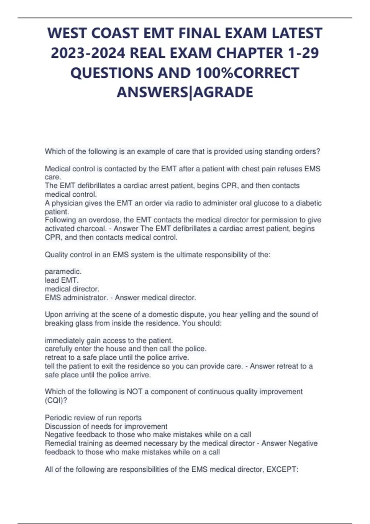 West Coast EMT Final Exam – Chapters 1–29 – 2023–2024 – Real Exam Questions with 100% Correct Answers (A Grade)