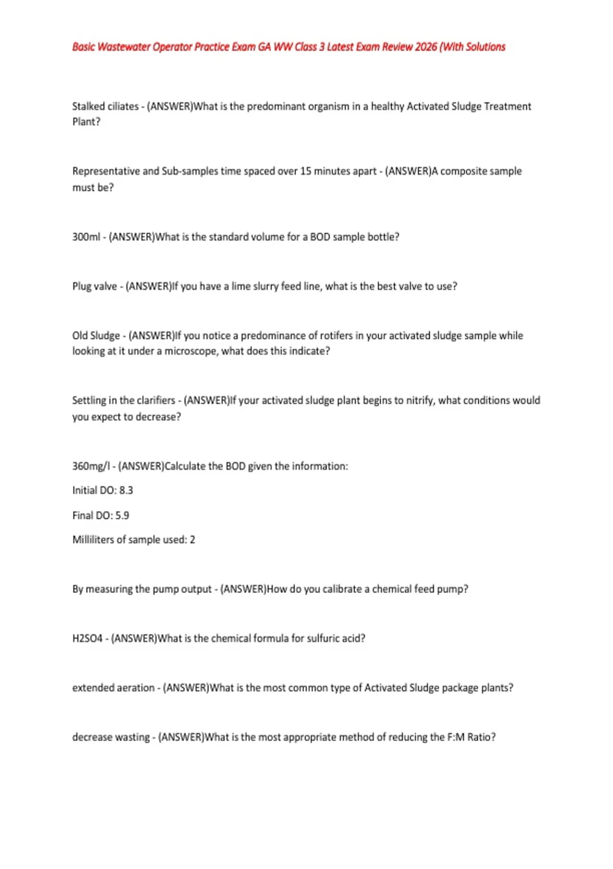 , Basic Wastewater Operator Practice Exam GA WW Class 3 Latest Exam Review 2026 (With Solutions