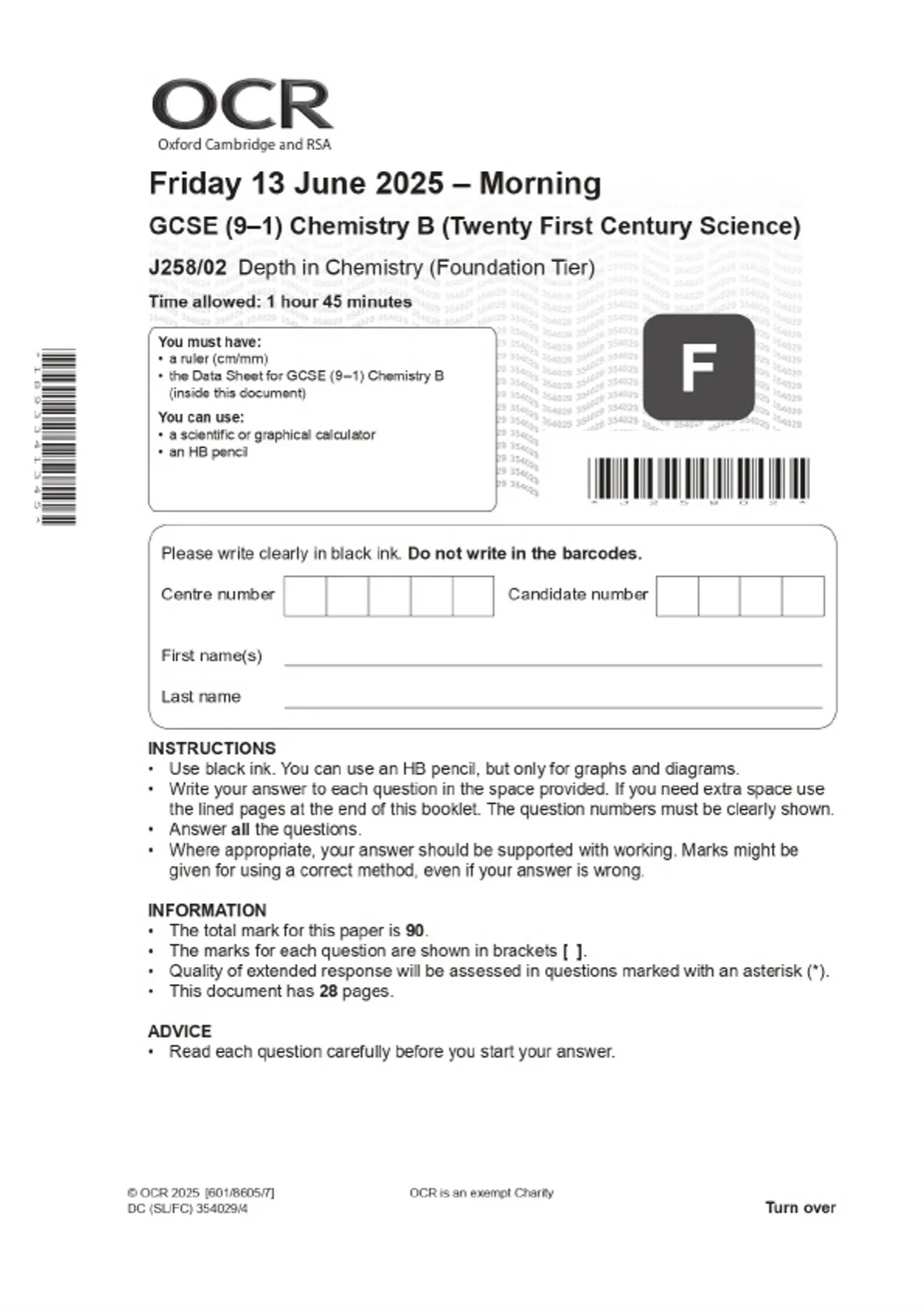 2025 OCR GCSE (9–1) Chemistry B (Twenty First Century Science) J258/02 Depth in Chemistry (Foundation Tier) Combined Question Paper & Final Marking Scheme