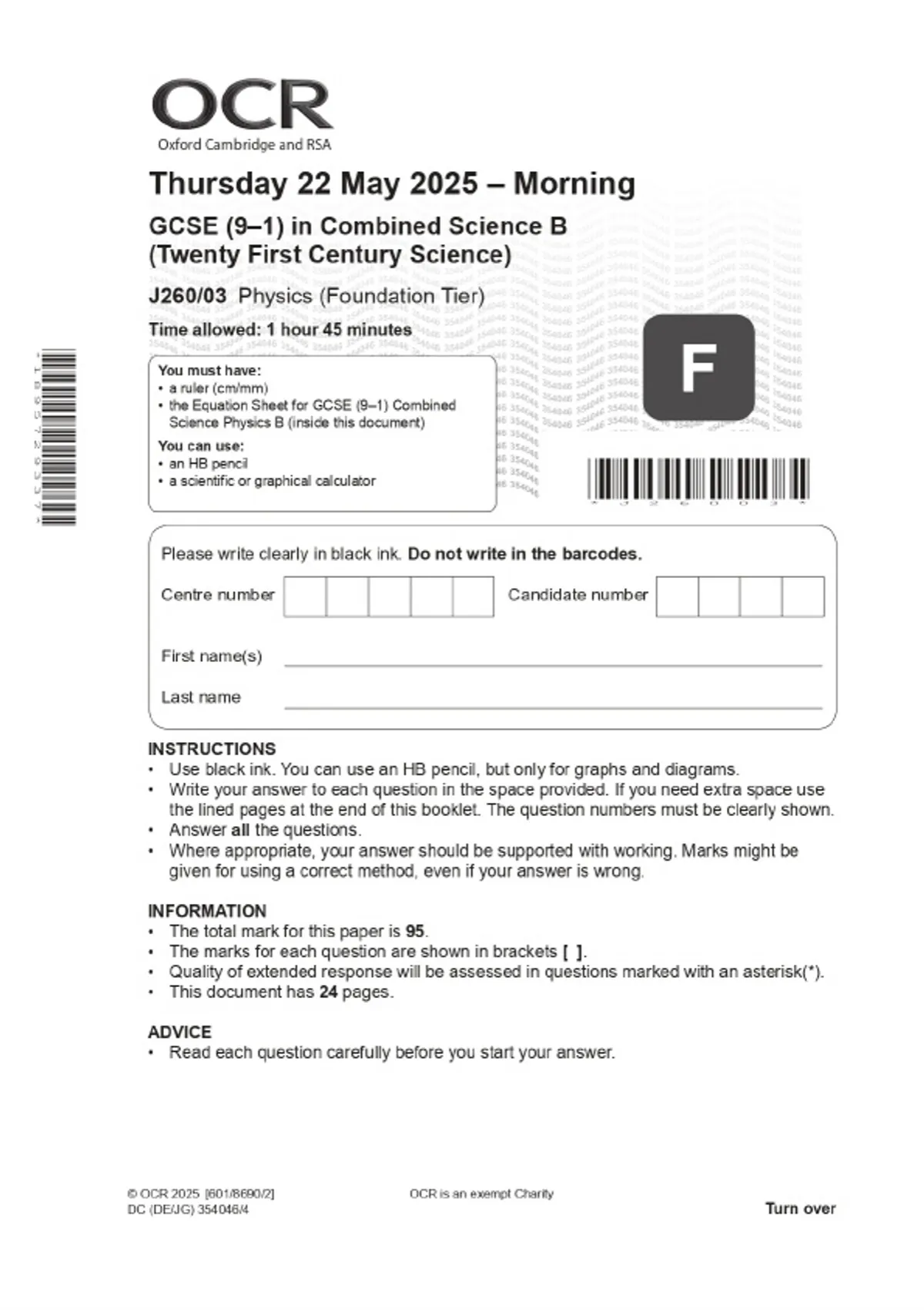 2025 OCR GCSE (9–1) in Combined Science B (Twenty First Century Science) J260/03 Physics (Foundation Tier) Combined Question Paper & Final Marking Scheme