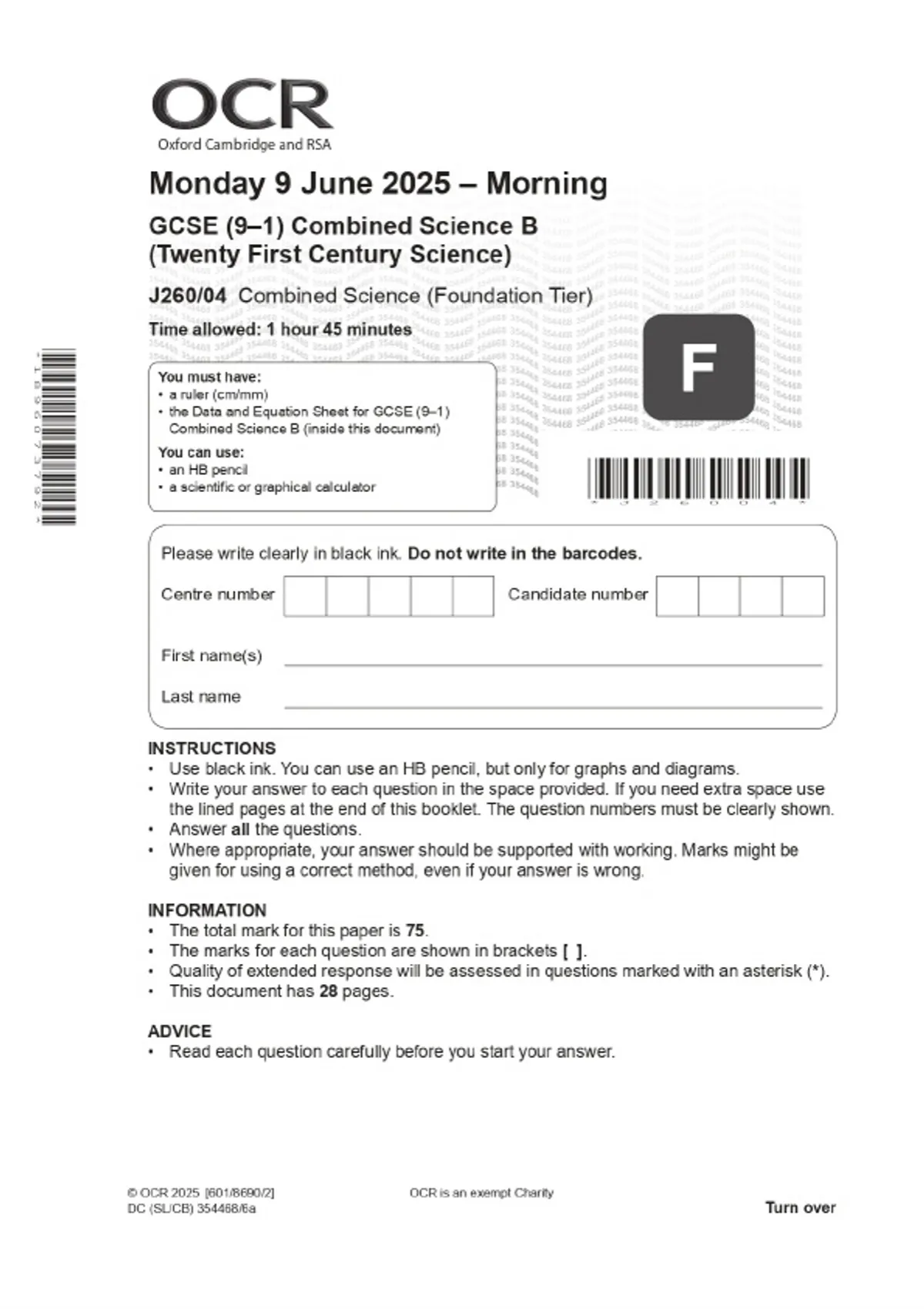 2025 OCR GCSE (9–1) Combined Science B (Twenty First Century Science) J260/04 Combined Science (Foundation Tier) Combined Question Paper & Final Marking Scheme