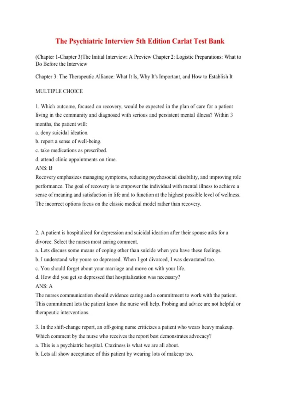 The Psychiatric Interview 5th Edition Carlat Test Bank 3 of 144 The Psychiatric Interview 5th Edition Carlat Test Bank.pdf