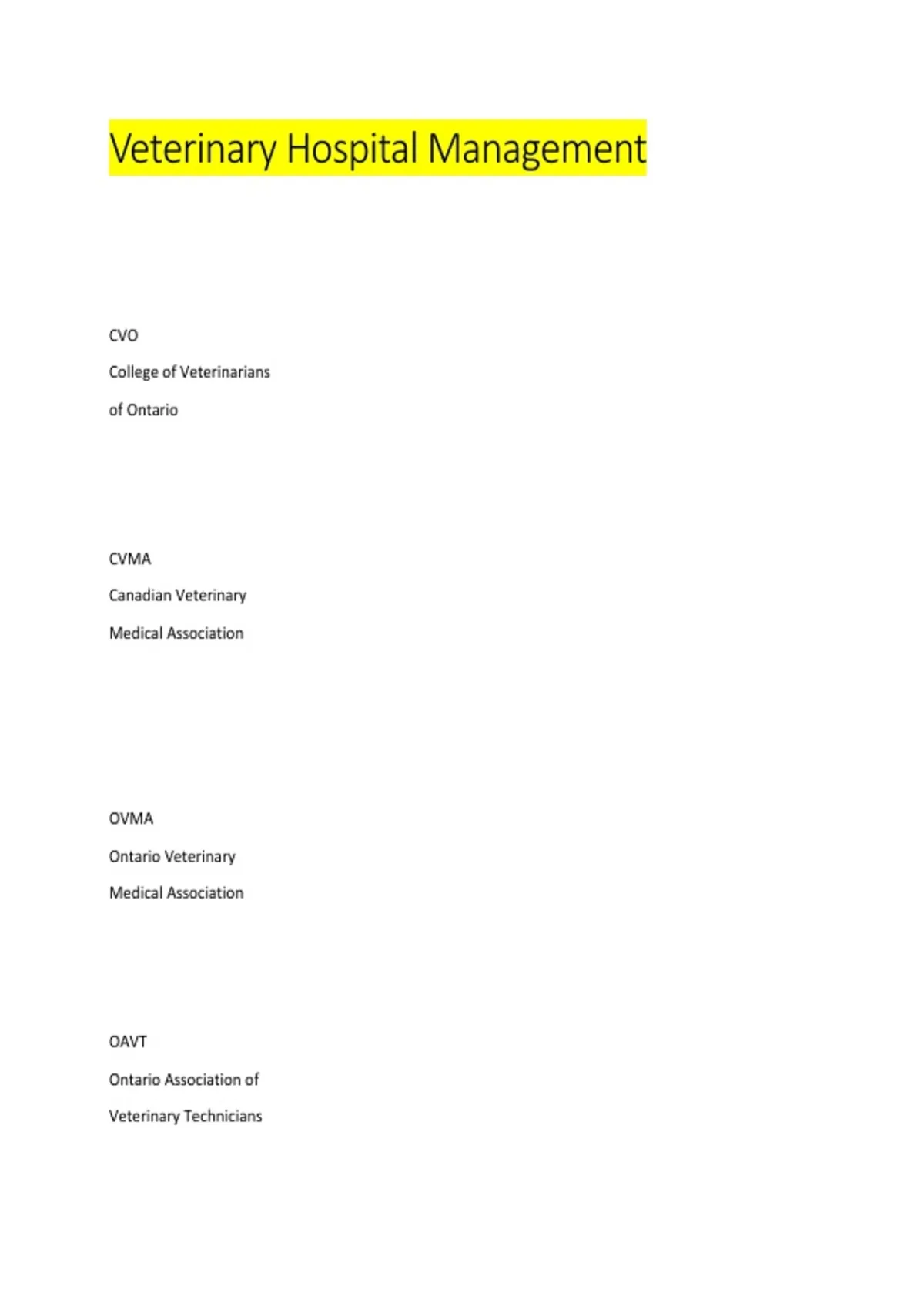 Access the 2026 Test Bank for Veterinary Hospital Management with 100% verified questions and detailed answers. Ideal for exam preparation, assignments, and mastering veterinary hospital operations and management concepts. Includes fully graded solutions and step-by-step explanations to help students and professionals achieve top grades and efficient practice administration skills.