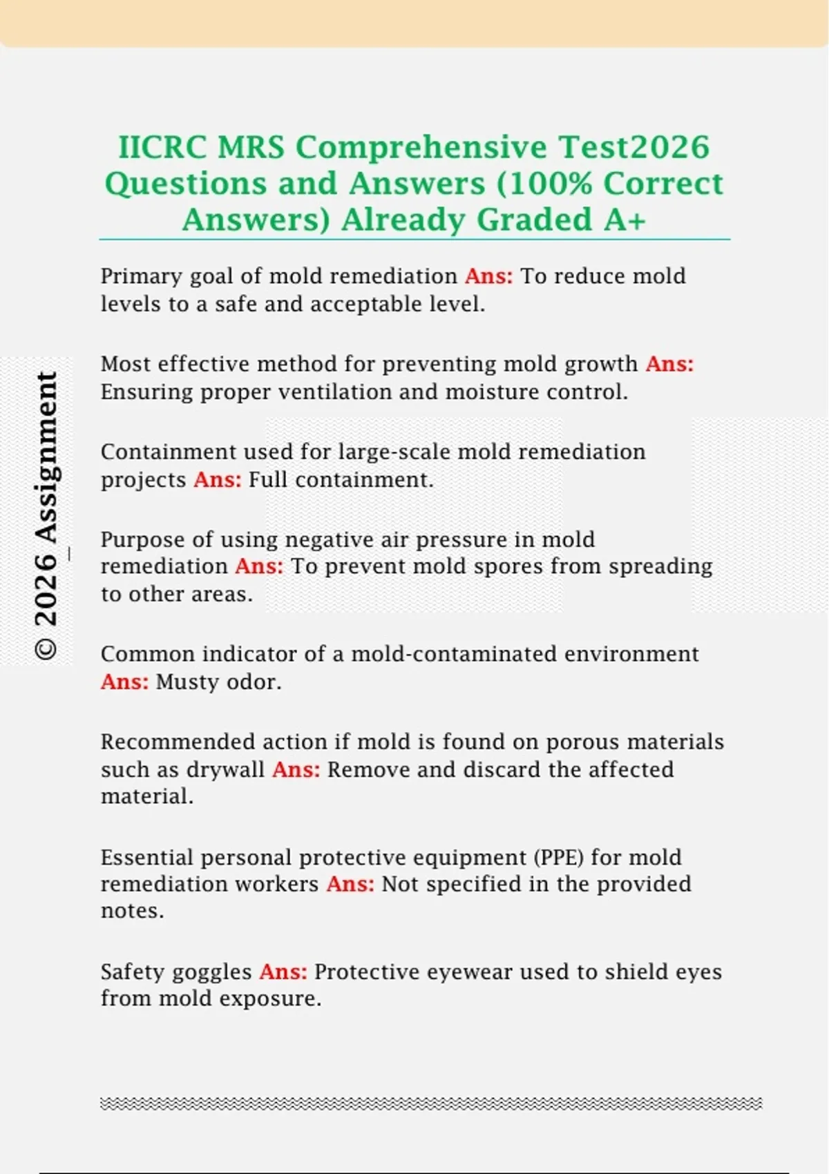 IICRC MRS Comprehensive Test2026 Questions and Answers (100% Correct Answers) Already Graded A+