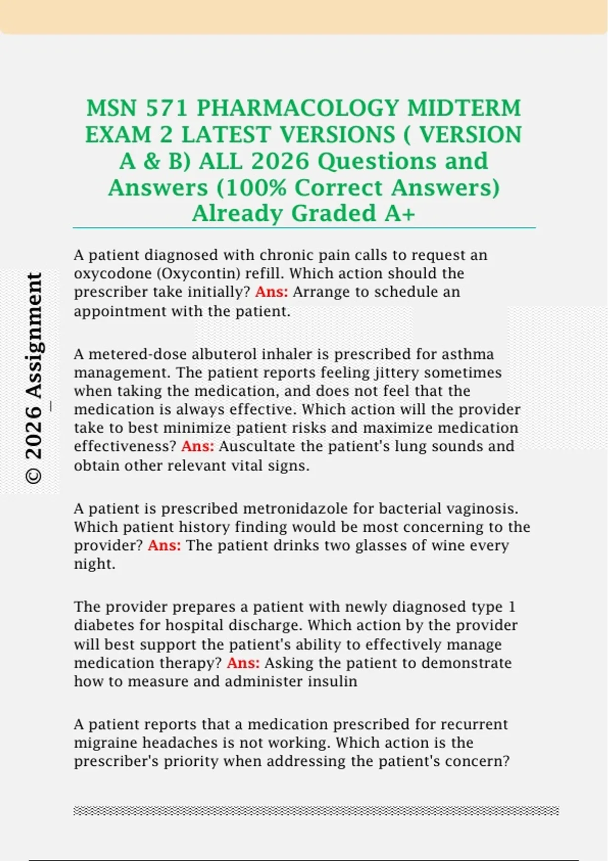 MSN 571 PHARMACOLOGY MIDTERM EXAM 2 LATEST VERSIONS ( VERSION A & B) ALL 2026 Questions and Answers (100% Correct Answers) Already Graded A+