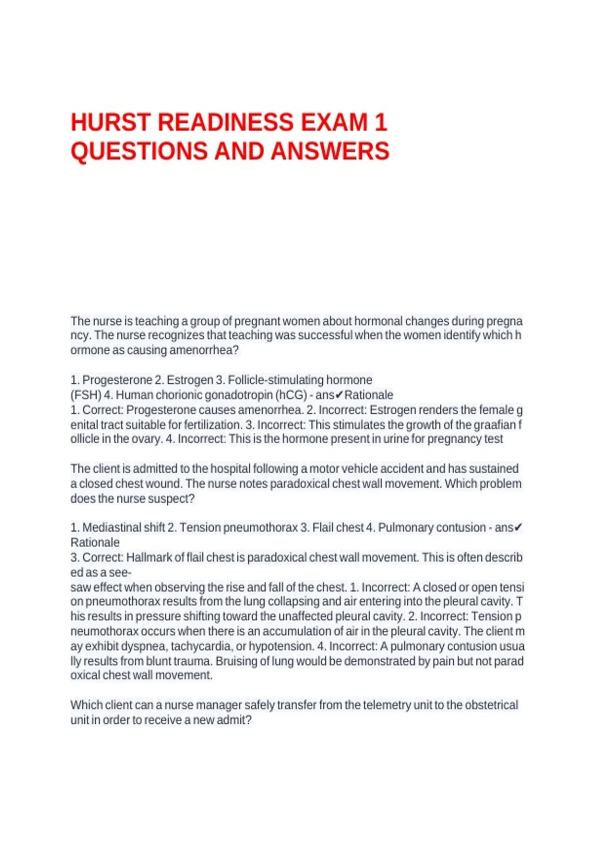 HURST READINESS EXAM 1 QUESTIONS AND ANSWERS