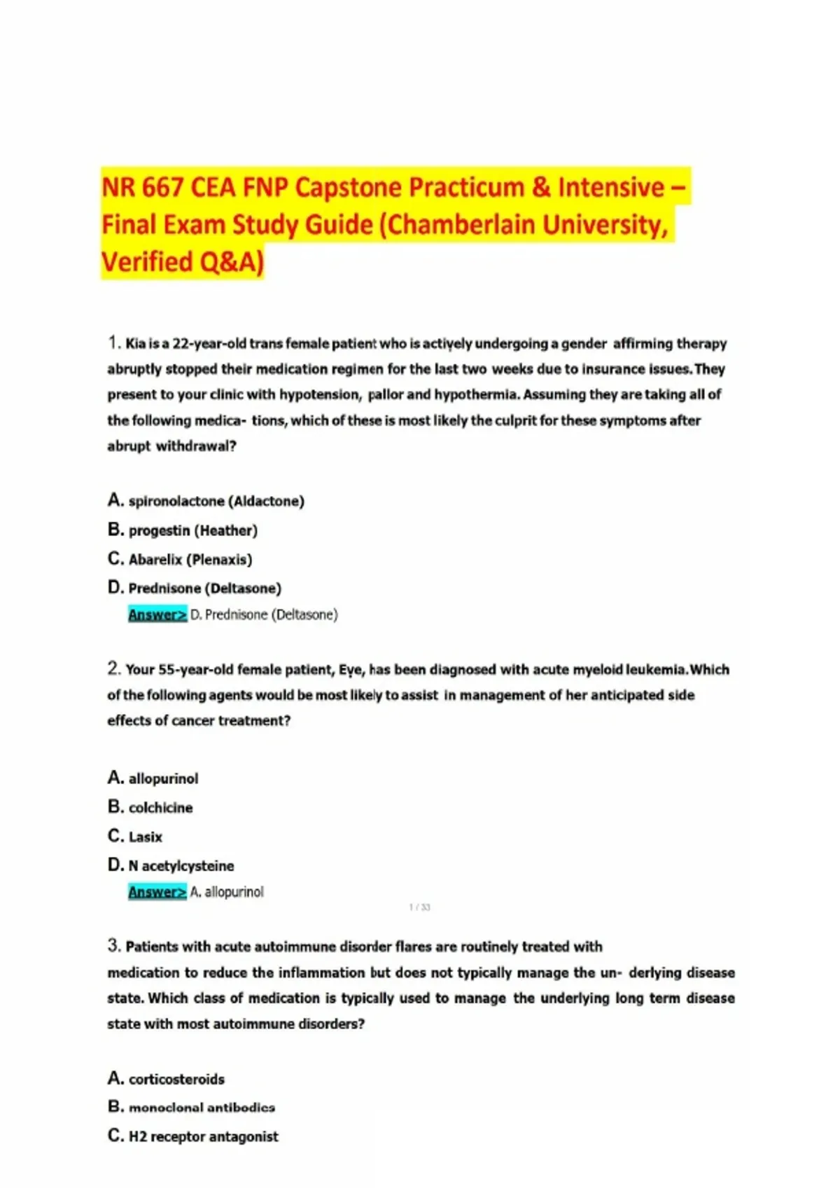 NR 667 CEA FNP Capstone Practicum & Intensive – Final Exam Study Guide (Chamberlain University, Verified Q&A)