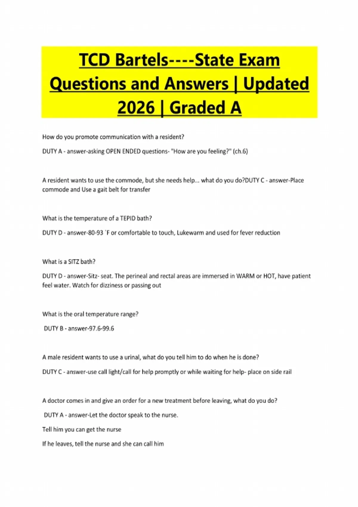 TCD Bartels----State Exam Questions and Answers | Updated 2026 | Graded A How do you promote communication with a resident? DUTY A - answer-asking OPEN ENDED questions- "How are you feeling?" (ch.6) A resident wants to use the commode, but she needs help... what do you do?DUTY C - answer-Place commode and Use a gait belt for transfer What is the temperature of a TEPID bath? DUTY D - answer-80-93 `F or comfortable to touch, Lukewarm and used for fever reduction What is a SITZ bath? DUTY D - answer-Sitz- seat. The perineal and rectal areas are immersed in WARM or HOT, have patient feel water. Watch for dizziness or passing out What is the oral temperature range? DUTY B - answer-97.6-99.6 A male resident wants to use a urinal, what do you tell him to do when he is done? DUTY C - answer-use call light/call for help promptly or while waiting for help- place on side rail A doctor comes in and give an order for a new treatment before leaving, what do you do? DUTY A - answer-Let the doctor speak to the nurse. Tell him you can get the nurse If he leaves, tell the nurse and she can call himDO NOT TAKE ORDERS How should you be positioned when applying TED hose? DUTY D - answer-Wide base of support, stand at foot of bed facing the patient Legs between 12-24 inches apart ,bend at your knees Raise bed to your waist level Check ever 2 hours. Remove every 8 hours for 30 min As a CNA, what can you do to help a resident who is being discharged? DUTY A - answer-Help gather personal items and pack Help them dress Get a wheelchair, take them to their car and help them into car Return to unit, strip bed and disinfect room