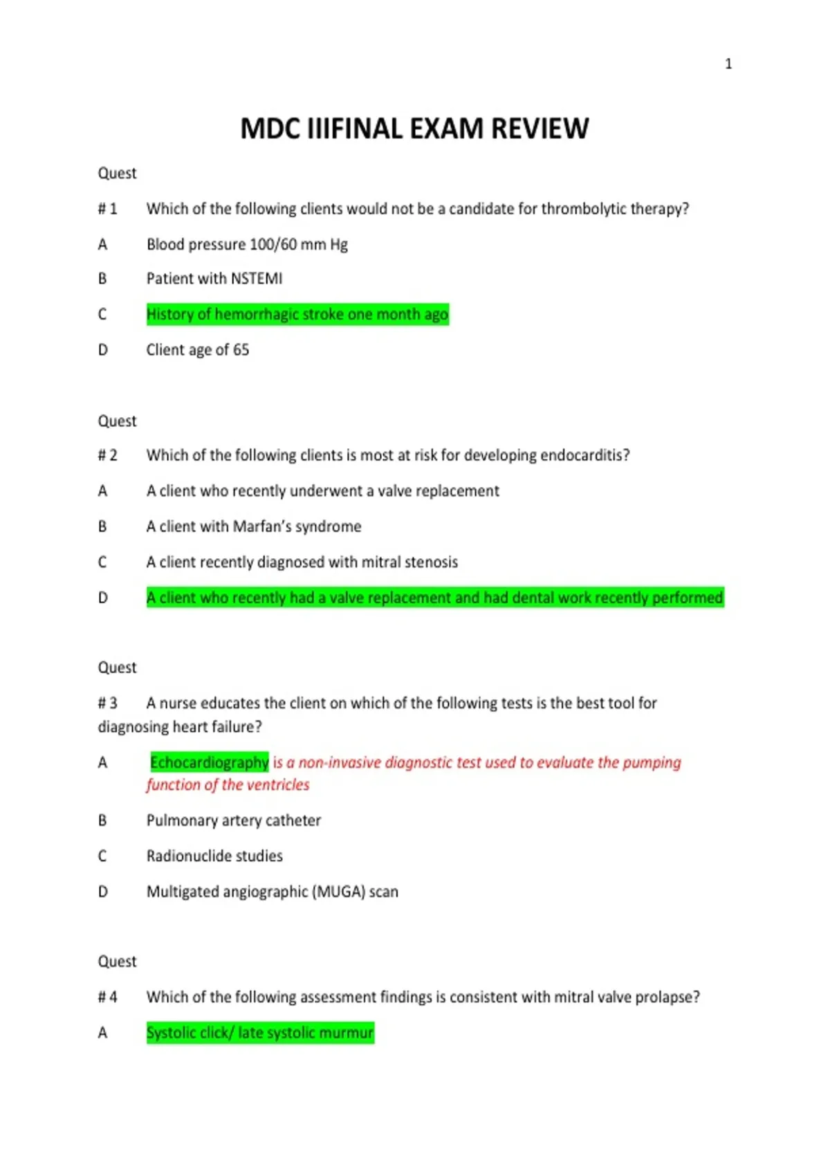 MDC 3 FINAL EXAM | VERIFIED WITH 100% CORRECT ANSWERS # 1 Which of the following clients would not be a candidate for thrombolytic therapy?A Blood pressure 100/60 mm HgB Patient with NSTEMIC History of hemorrhagic stroke one month agoD Client age of 65Quest# 2 Which of the following clients is most at risk for developing endocarditis?A A client who recently underwent a valve replacementB A client with Marfan’s syndromeC A client recently diagnosed with mitral stenosisD A client who recently had a valve replacement and had dental work recently performedQuest# 3 A nurse educates the client on which of the following tests is the best tool fordiagnosing heart failure?A Echocardiography is a non-invasive diagnostic test used to evaluate the pumpingfunction of the ventriclesB Pulmonary artery catheterC Radionuclide studiesD Multigated angiographic (MUGA) scanQuest# 4 Which of the following assessment findings is consistent with mitral valve prolapse?A Systolic click/ late systolic murmur2B Urinary frequencyC Atrial fibrillationD ClaudicationQuest# 5 Which of the following is a treatment option for a client with infective endocarditis?A Antimicrobials- An antimicrobial is an agent that kills microorganisms or stops theirgrowth examples include- penicillin G, procaine penicillin, benzathine penicillin, andpenicillin V.B AnticoagulantsC Diet modificationD BedrestQuest# 6 A 36-year-old male Is being discharged home following a sickle cell pain crisis. Whatwould be a top priority in your discharge teaching?• A Increase fluid intake- Get enough oxygen, Avoid getting over-heated or gettingvery cold, Avoid getting infections, and quickly treat infections when you do get themB Decrease fluid intakeC Maintain bed restD Follow up with your primary care provider in 2-3 daysQuest# 7 Which of the following is NOT a treatment option for a patient with sickle cell disease?A Pain managementB Arthrocentesis- Arthrocentesis, commonly known as joint aspiration, is a minor surgicalprocedure during which excess synovial fluid (fluid from a joint) is drained with a sterileneedle and syringe.C Blood transfusion3D Hematopoietic stem cell transplantNoteThe primary symptom associated with sickling is pain. During sickle cell crisis the pain is quitesevere as a result of tissue ischemia. The back, chest, extremities, and abdomen are mostcommonly affected. Pain episodes are accompanied by fever, swelling, tenderness, tachypnea,hypertension, and nausea and vomiting.Preventing painful episodes of sickle cellThe main thing you can do to reduce your chances of experiencing a painful episode (sickle cellcrisis) is to try avoiding possible triggers.i. drink plenty of fluids to avoid dehydrationii. wear warm clothing to stop you from getting coldiii. avoid sudden temperature changes, such as swimming in cold waterQuest# 8 Which of the following is not a possible treatment plan for a client diagnosed withleukemia?A Induction and consolidation therapyB Surgical interventionC Stem cell transplantD Blood product transfusionQuest# 9 A nurse is caring for a client recently diagnosed with pericarditis. Which of the followingis a common assessment finding with this disorder?A ST-segment depressionB Pericardial friction rubC Elevated troponinD Heart failureQuest4# 10 A nurse is caring for a 19-year-old male recently diagnosed with leukemia. Which of thefollowing interventions are appropriate for the care of this client? (Select all that apply)A Strict hand hygiene to prevent infectionB Provide emotional supportC Restrict fluid and dietary intakeD Protect from injury due to thrombocytopenia10.B The nurse questions which order for a client with thrombocytopenia?a. Avoid IM injections.*b. Administer enemas.c. Apply ice to areas of trauma.d. Test all urine and stool for the presence of occult blood.10C. The client has thrombocytopenia. Which client statement indicates that the clientunderstands the condition?the self-management of this condition?a. “I brush and use dental floss every day.”b. “I chew hard candy for my dry cough.”c. “I usually put ice on bumps or bruises.”d. “Nonslip socks are best when I walk.”Quest# 11A The nurse is caring for a 55-year-old male presented to his primary physician’s office forhis yearly checkup. Upon the physical assessment, the provider noted enlarged lymph nodes inthe groin and neck region. The provider questioned Joe regarding the possible causes of thefinding. Which of the following diagnosis are consistent with this finding?A LymphomaB Sickle cell anemiaC LeukemiaD Polycythemia Vera5Quest#11B A nursing student is caring for a patient with leukemia. The student asks why the patientis still at risk for infection when the patient’s white blood cell count (WBC) is high. Whatresponse by the registered nurse is best?A. “If the WBCs are high, there already is an infection present.”B. “The patient is in a blast crisis and has too many WBCs.”C. “There must be a mistake; the WBCs should be very low.”*D. “Those WBCs are abnormal and don’t provide protection.”# 12 A nurse is caring for a client diagnosed with polycythemia vera. Which of the followingshould the nurse NOT include in the client and family education?A Increase fluid intake to at least three liters per dayB Wear support hose while awakeC Diet modification to limit foods high in vitamin K intakeD Resume normal activityPolycythemia is the production and presence of an increased number of RBCs.PV is defined as elevated red blood cells (RBCs), hematocrit (Hct), and hemoglobin (Hgb)laboratory values; PV is also referred to as erythrocytosis .Quest# 13 Which of the following is a treatment option for a client with severe dilatedcardiomyopathy?A Ventricular assistive deviceB Percutaneous alcohol septal ablationC Heart transplantD MyomectomyQuest# 14 Which patient is not a risk for iron deficiency anemia?6A A 24-year-old female with heavy mensesB 64-year-old male diabetic with chronic kidney diseaseC A 72-year-old male w