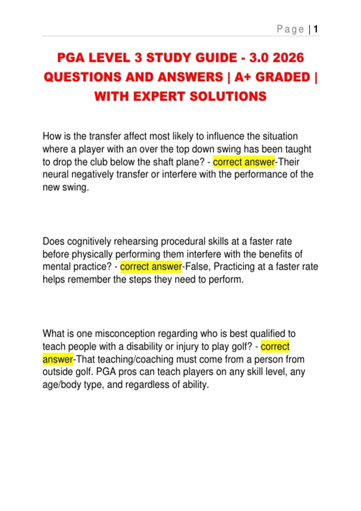 This document contains a comprehensive PGA Level 3 Study Guide (Version 3.0) for 2026, presented in a detailed questions-and-answers format with expert-verified solutions. It covers core PGA curriculum areas including teaching and coaching theory, motor learning, skill transfer, mental practice, lesson planning, technology use, club fitting, ball flight laws, on-course instruction, leadership, delegation strategies, motivation, performance management, and golf facility operations. The material is structured for PGA candidates preparing for Level 3 exams and practical assessments, offering both technical and managerial mastery.