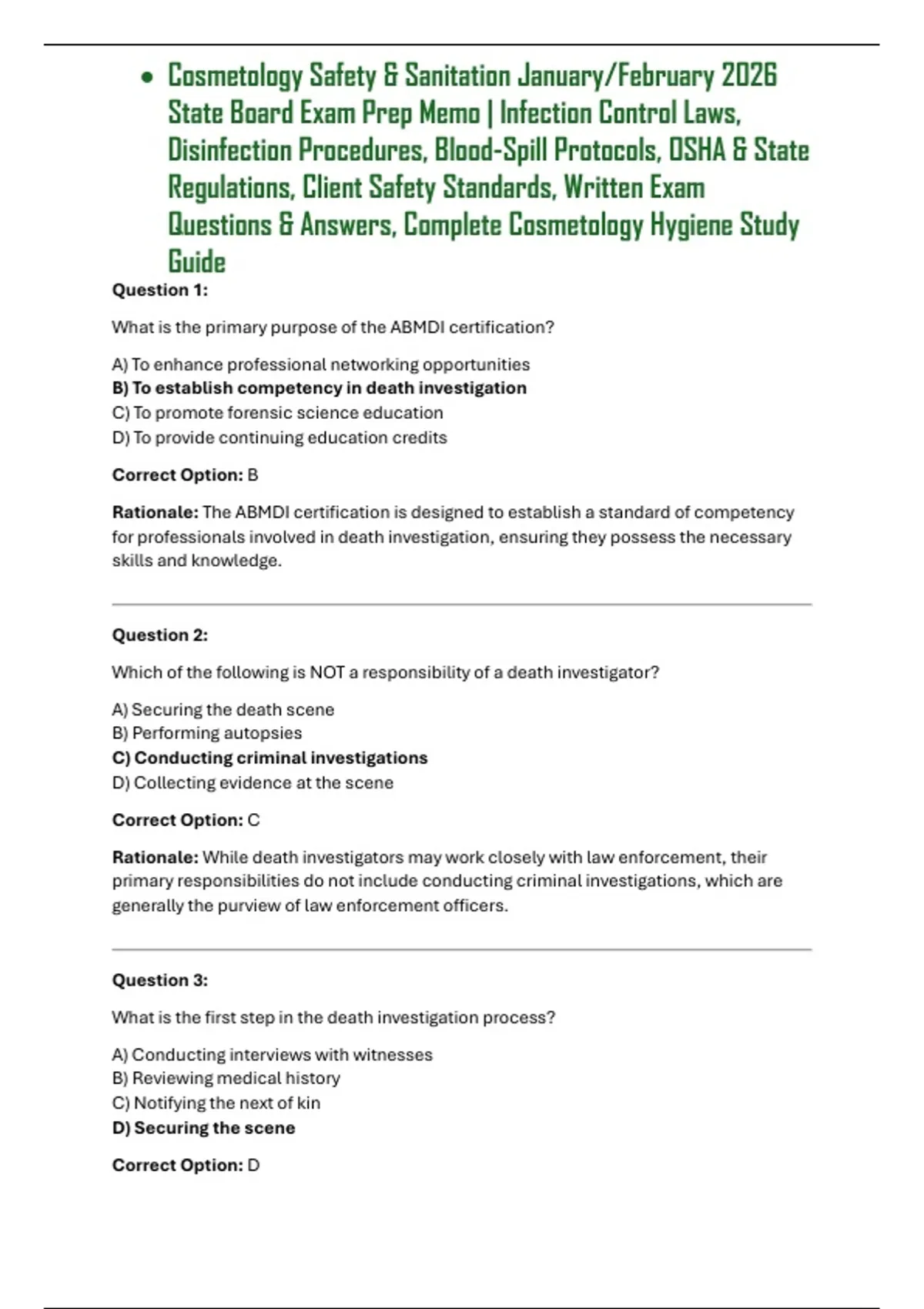 Cosmetology Safety & Sanitation January/February 2026 State Board Exam Prep Memo | Infection Control Laws, Disinfection Procedures, Blood-Spill Protocols, OSHA & State Regulations, Client Safety Standards, Written Exam Questions & Answers, Complete Cosmet