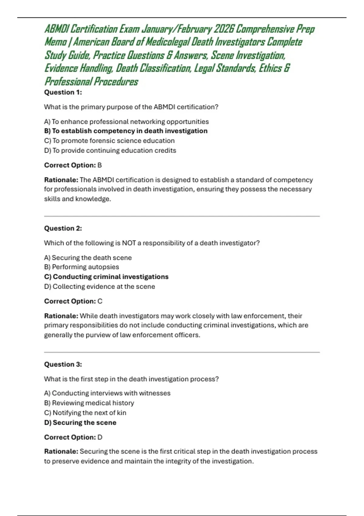 ABMDI Certification Exam January/February 2026 Comprehensive Prep Memo | American Board of Medicolegal Death Investigators Complete Study Guide, Practice Questions & Answers, Scene Investigation, Evidence Handling, Death Classification, Legal Standards, E