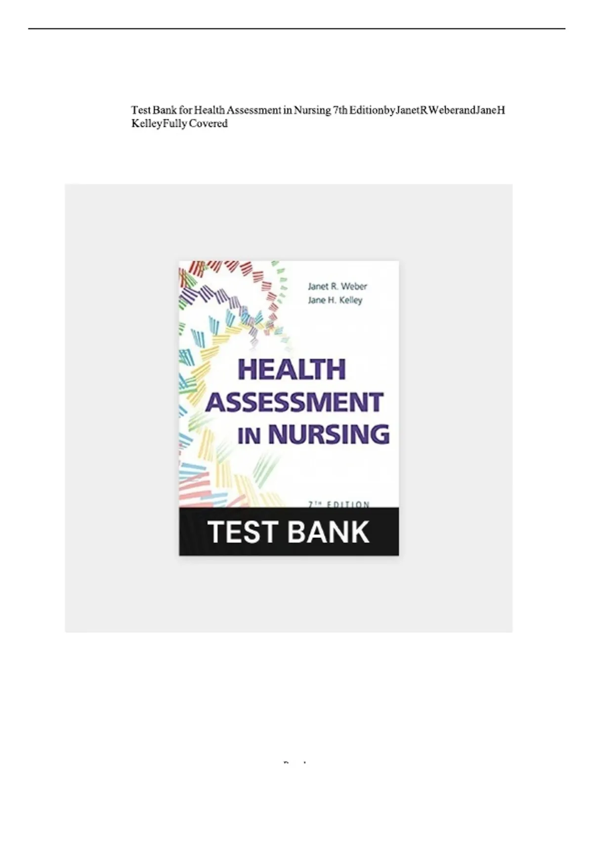 TEST BANK Health Assessment in Nursing (7TH) by Janet R Weber & Jane H Kelley Chapters 1-34 UPDATED| Latest Practice Exam 100% Verified Answers. The Test Bank for Health Assessment in Nursing 7th Edition by Janet R Weber & Jane H Kelley is a comprehensive study guide specifically designed to enhance your understanding of the main concepts presented in the associated book. This invaluable resource serves as an excellent learning tool, offering detailed questions and answers that facilitate comprehension of the material. The nursing test bank includes numerous practical scenarios which reflect real-world challenges, helping you to apply your knowledge and prepare for examinations. Whether you're looking to download the test bank for immediate use or seeking a free preview, the Weber & Kelley Health Assessment Test Bank ensures efficient and effective study. This test bank is not just a collection of questions but a pathway to success in your nursing health assessment studies. It's more than a PDF—it's your academic lifeline. So, delve into the Health Assessment in Nursing 7th Edition Test Bank, and make the most of this unparalleled educational tool.