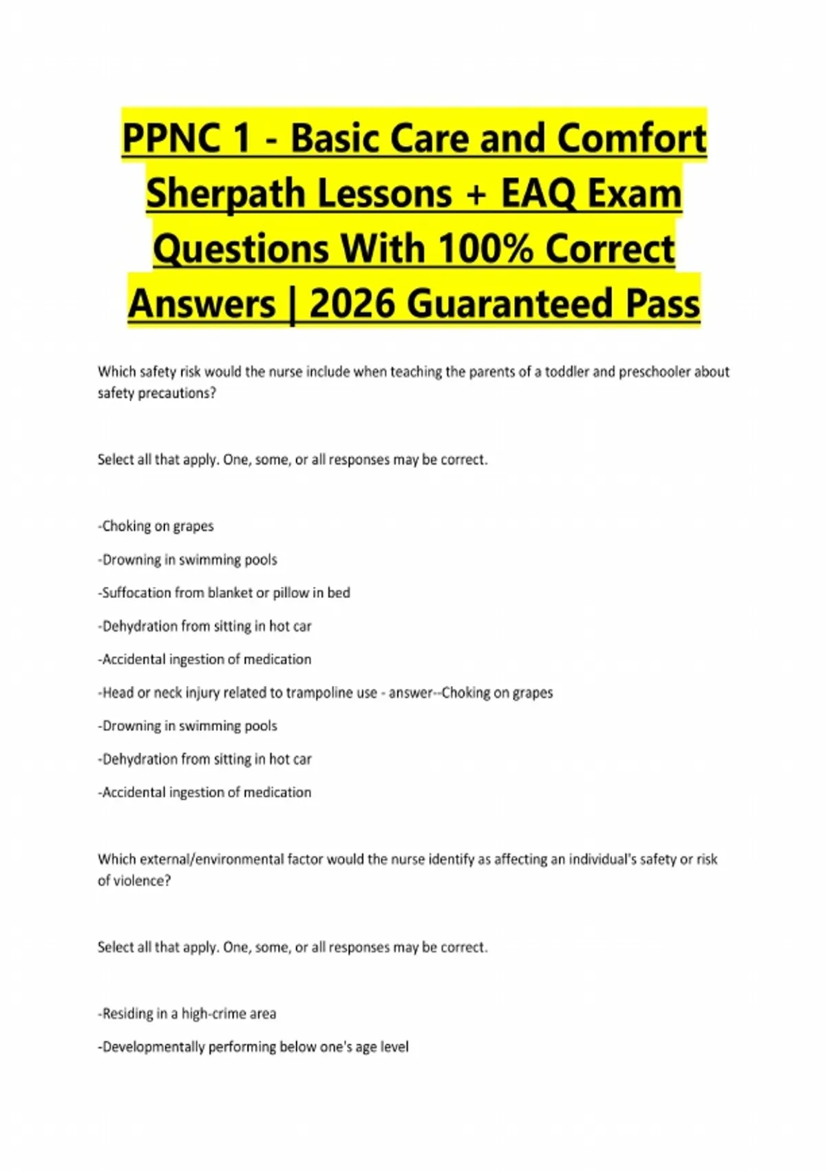 PPNC 1 - Basic Care and Comfort Sherpath Lessons + EAQ Exam Questions With 100% Correct Answers | 2026 Guaranteed Pass Which safety risk would the nurse include when teaching the parents of a toddler and preschooler about safety precautions? Select all that apply. One, some, or all responses may be correct. -Choking on grapes -Drowning in swimming pools -Suffocation from blanket or pillow in bed -Dehydration from sitting in hot car -Accidental ingestion of medication -Head or neck injury related to trampoline use - answer--Choking on grapes -Drowning in swimming pools -Dehydration from sitting in hot car -Accidental ingestion of medication Which external/environmental factor would the nurse identify as affecting an individual's safety or risk of violence? Select all that apply. One, some, or all responses may be correct. -Residing in a high-crime area -Developmentally performing below one's age level-Living with an abusive, alcoholic individual -Being diagnosed with cerebral palsy at a very young age -Being an adult over 65 years of age - answer--Residing in a high-crime area -Living with an abusive, alcoholic individual Which factor threatens safety if the patient states that they have recently experienced poor hand and eye coordination? -Workplace culture -Lifestyle factors -Impaired mobility -Impaired cognition - answer--Impaired mobility Which agency has developed goals that highlight specific evidence-based patient safety initiatives for preventing medical errors that agencies should focus on? -National Quality Forum (NQF): leads the national collaboration among health care agencies and the public to improve health care quality through measurement by creating standards to measure and report on quality and efficiency of health care. -The Joint Commission (TJC): highlight specific evidence-based patient safety initiatives and goals for preventing ongoing problematic areas that agencies should focus specific actions on. -Centers for Medicare and Medicaid Services (CMS): focuses on administering the Medicare program and working with states Medicaid insurances to improve quality, equity, and outcomes of health care. -Quality and Safety Education for Nurses (QSEN): focus on integrating knowledge, skills, and attitudes into nursing education. - answer--The Joint Commission Which nursing specialty would be least likely to have workplace injury related to a chemical exposure? -Occupational health nurse -Oncology nurse -Operating room (OR) circulating nurse -Infectious disease nurse - answer--Occupational health nurse Which factor is an intrinsic patient-related fall risk hazard?
