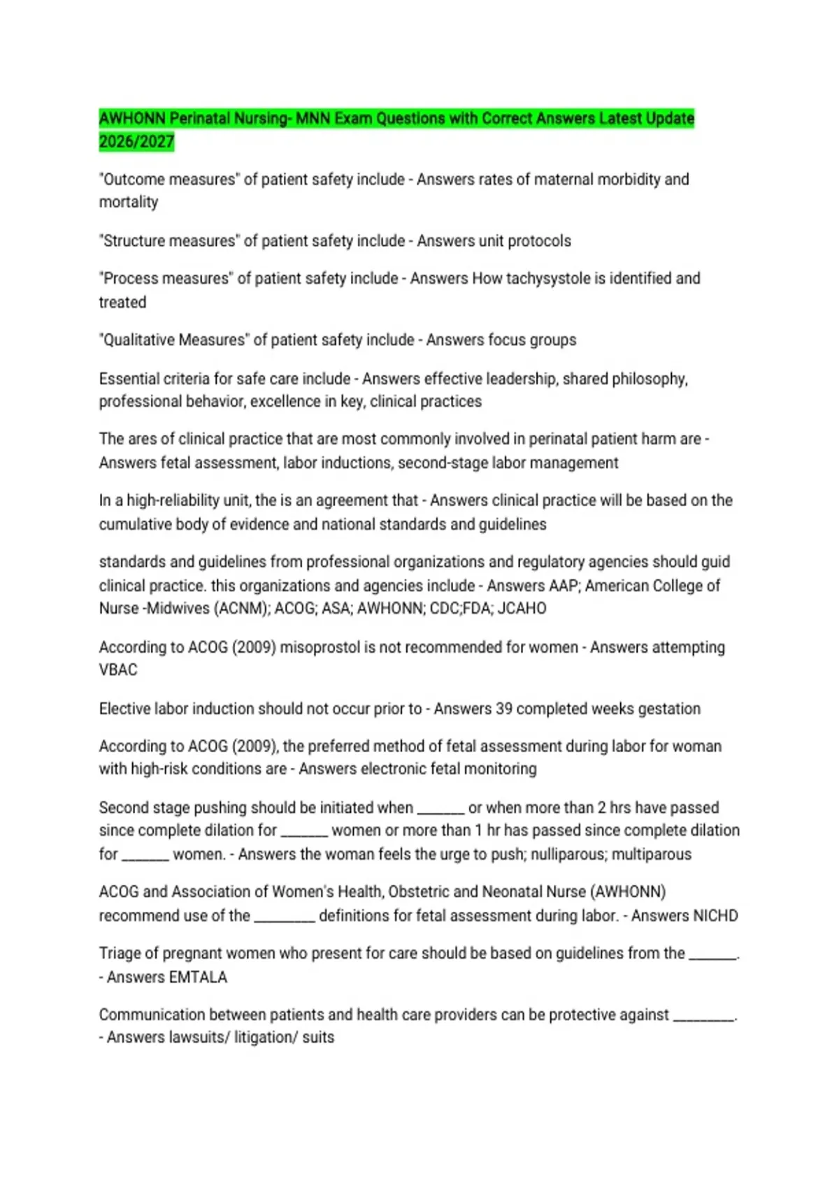 AWHONN Perinatal Nursing- MNN Exam Questions with Correct Answers Latest Update 2026/2027 "Outcome measures" of patient safety include - Answers rates of maternal morbidity and mortality "Structure measures" of patient safety include - Answers unit protocols "Process measures" of patient safety include - Answers How tachysystole is identified and treated "Qualitative Measures" of patient safety include - Answers focus groups Essential criteria for safe care include - Answers effective leadership, shared philosophy, professional behavior, excellence in key, clinical practices The ares of clinical practice that are most commonly involved in perinatal patient harm are - Answers fetal assessment, labor inductions, second-stage labor management In a high-reliability unit, the is an agreement that - Answers clinical practice will be based on the cumulative body of evidence and national standards and guidelines standards and guidelines from professional organizations and regulatory agencies should guid clinical practice. this organizations and agencies include - Answers AAP; American College of Nurse -Midwives (ACNM); ACOG; ASA; AWHONN; CDC;FDA; JCAHO According to ACOG (2009) misoprostol is not recommended for women - Answers attempting VBAC Elective labor induction should not occur prior to - Answers 39 completed weeks gestation According to ACOG (2009), the preferred method of fetal assessment during labor for woman with high-risk conditions are - Answers electronic fetal monitoring Second stage pushing should be initiated when _______ or when more than 2 hrs have passed since complete dilation for _______ women or more than 1 hr has passed since complete dilation for _______ women. - Answers the woman feels the urge to push; nulliparous; multiparous ACOG and Association of Women's Health, Obstetric and Neonatal Nurse (AWHONN) recommend use of the _________ definitions for fetal assessment during labor. - Answers NICHD Triage of pregnant women who present for care should be based on guidelines from the _______. - Answers EMTALA Communication between patients and health care providers can be protective against _________. - Answers lawsuits/ litigation/ suits During clinical emergencies, the timing of medical record documentation is often - Answers retrospective The practice of duplicate documentation on the fetal monitoring strip and the medical record is __________, and it contributes to ____________. - Answers outdated; error A serious adverts event is defined by TJC as a _________. - Answers sentinel event The recommended nurse to nurse ration during oxytocin administration is: - Answers 1:1 What happens to maternal PaO2 and PaCO2 levels during pregnancy - Answers PaO2 increases and PaCO2 decreases The slight pH that occurs during pregnancy is due to - Answers an increase in ventilatory rate During pregnancy, serum urea and creatine levels - Answers decrease Which of the following coagulation factors does not increase during pregnancy - Answers platelets Which of the following increases during pregnancy a. colloid oncotic pressure b. glomerular filtration rate c. serum osmolality - Answers b. glomerular filtration rate The respiratory system parameter that decreases during pregnancy is the - Answers functional residual capacity metabolic change characteristic of late pregnancy is decreases - Answers insulin sensitivity cardiac output during pregnancy increases to approximately - Answers 30-50% the volume of the maternal auto transfusion immediately after birth is approximately - Answers 1,000 ml by 28-34 weeks gestation in a normal pregnancy, blood volume has increased by - Answers 30-50% Metabolic changes are characterized by _______ during the first half of pregnancy and _________ during the second half. - Answers anabolism; catabolism The greater increase in plasma volume than in red blood cell volume results in ___________. - Answers hemodilution Maternal weight gain during the first half of pregnancy is primarily due to changes in the weight