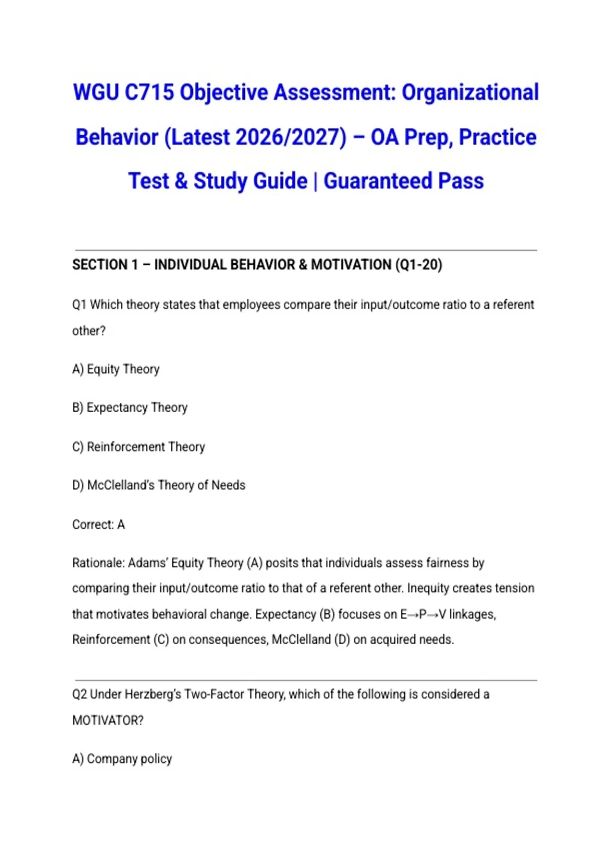 Rationale: Adams’ Equity Theory (A) posits that individuals assess fairness by