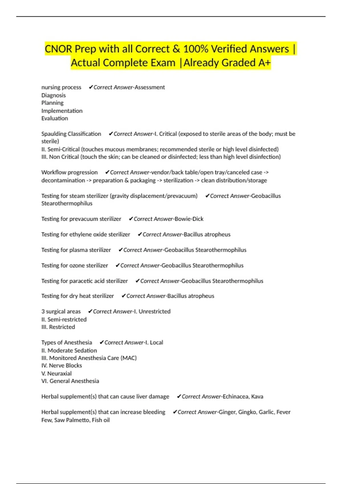 CNOR Prep with all Correct & 100% Verified Answers |Actual Complete Exam |Already Graded A+