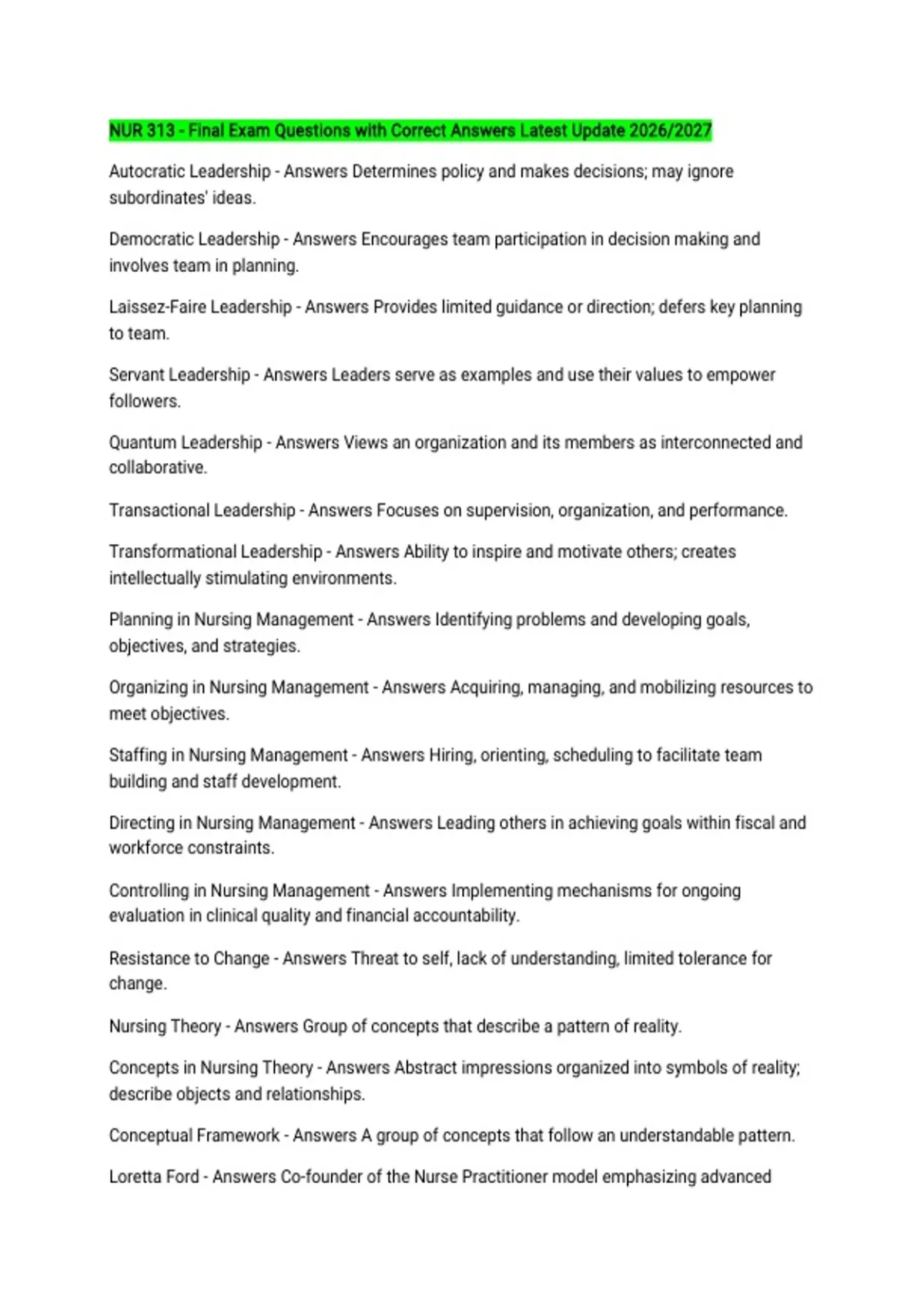 Laissez-Faire Leadership - Answers Provides limited guidance or direction; defers key planning