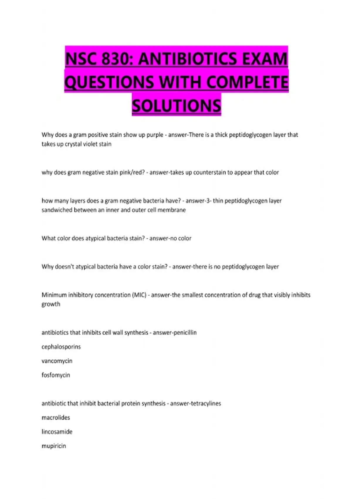 NSC 830: ANTIBIOTICS EXAM QUESTIONS WITH COMPLETE SOLUTIONS Why does a gram positive stain show up purple - answer-There is a thick peptidoglycogen layer that takes up crystal violet stain why does gram negative stain pink/red? - answer-takes up counterstain to appear that color how many layers does a gram negative bacteria have? - answer-3- thin peptidoglycogen layer sandwiched between an inner and outer cell membrane What color does atypical bacteria stain? - answer-no color Why doesn't atypical bacteria have a color stain? - answer-there is no peptidoglycogen layer Minimum inhibitory concentration (MIC) - answer-the smallest concentration of drug that visibly inhibits growth antibiotics that inhibits cell wall synthesis - answer-penicillin cephalosporins vancomycin fosfomycin antibiotic that inhibit bacterial protein synthesis - answer-tetracylines macrolides lincosamide mupiricinoxazolididone aminoglycoside MISC method of action antibiotic - answer-fluoroquinolones - DNA metronidazole sulfonamides - DNA nitrofurantion- DNA which abx are ONLY gram negative - answer-aminoglycosides metronidazole which abx are ONLY gram positive - answer-Vancomycin oxazolidinone which abx are gram -/+/atypical - answer-tetracylines macrolides sulfonamides are penicillins broad or narrow spectrum? - answer-both When to use broad spectrum PCN - answer-Acute sinusitis strep pharyngitis cellulitis acute otitis media uncomplicated UTI indication for 1st gen cephalosporins - answer-skin infection surgical prophylaxis CA- MRSAWhen to use 2nd gen cephalosporins - answer-otitis media acute sinusitis UTI Resp. tract infecton indication for 3rd gen cephalosporins - answer-otitis media (complicated/severe) CAP meningitis