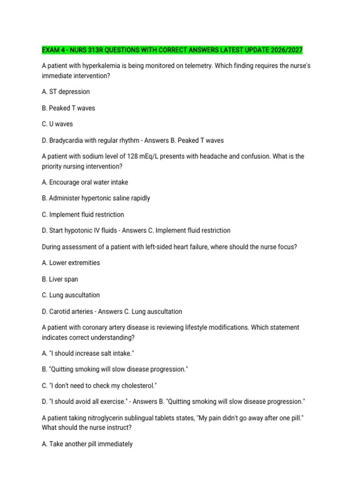 D. Start hypotonic IV fluids - Answers C. Implement fluid restriction