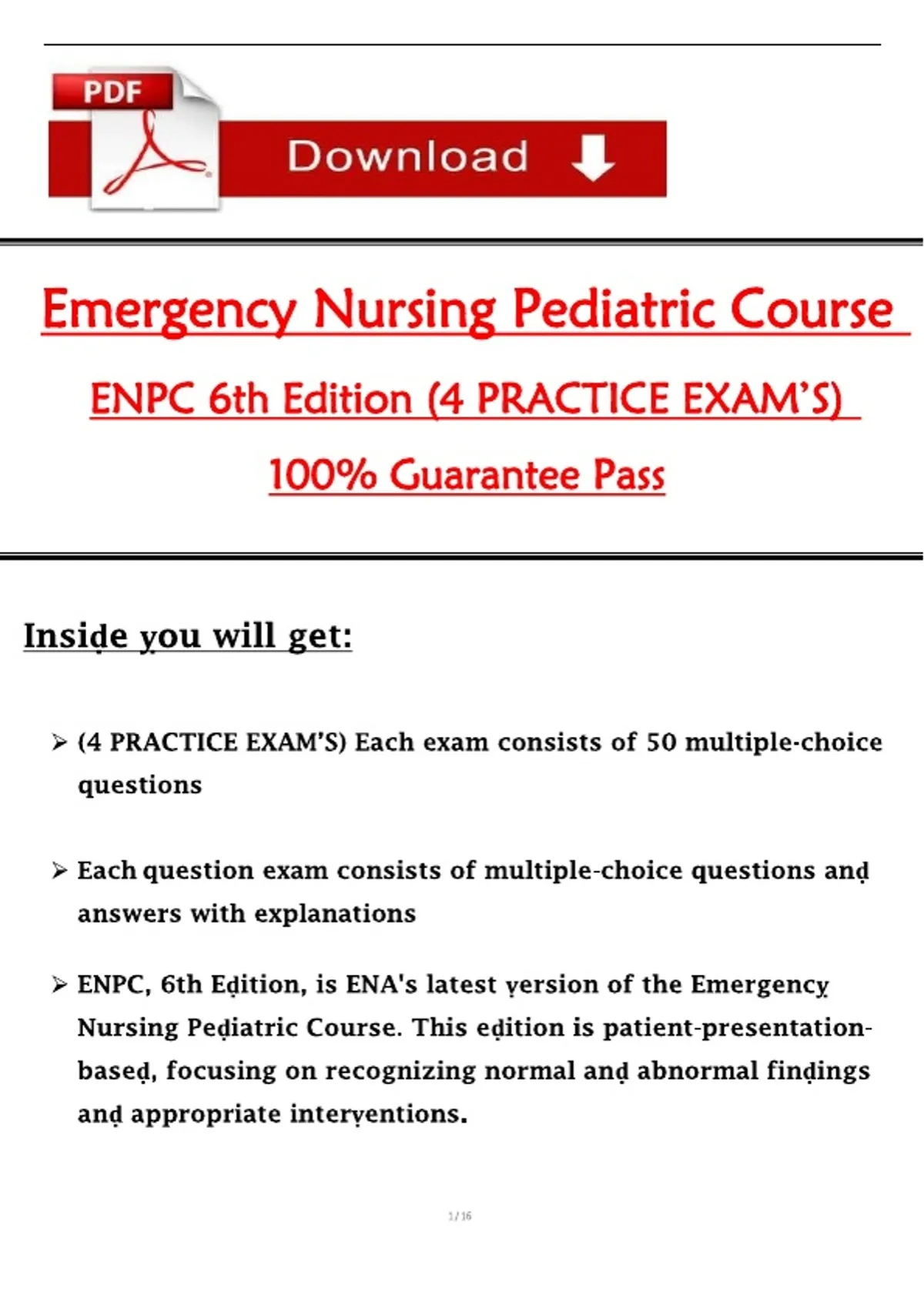 This exam preparation resource is designed for the ENPC 6th Edition and includes four full practice exams covering pediatric emergency nursing care. Content focuses on pediatric assessment, trauma and medical emergencies, respiratory and cardiac conditions, neurologic emergencies, shock, fluid and electrolyte management, and prioritization of care based on current ENPC guidelines